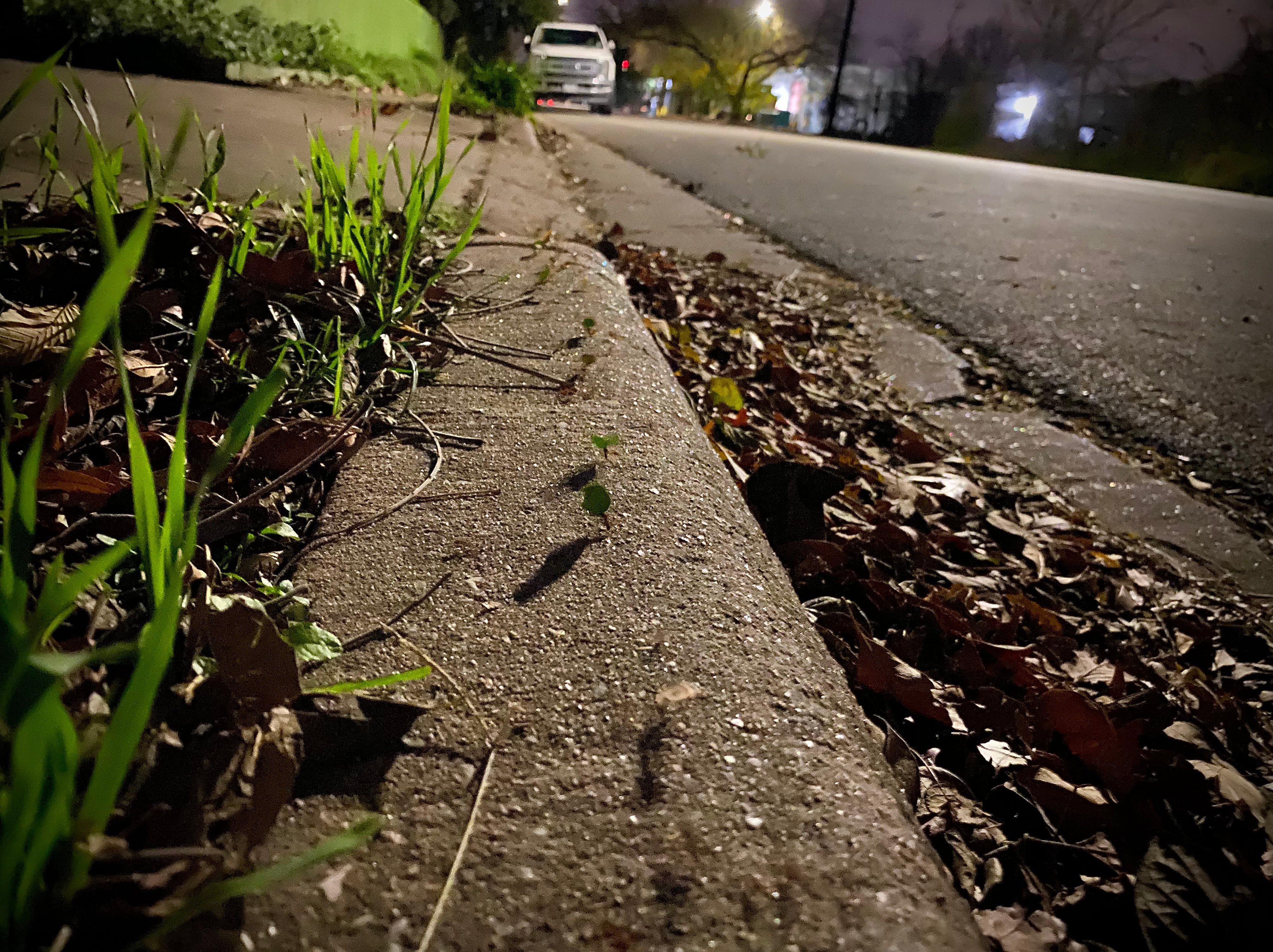 In the thin stretch of weedy dirt that runs between the sidewalk and curb of our long block, little divots appear every morning where armadillos have been digging up grubs while we sleep. I had noticed a fresh armadillo den outside my trailer earlier in the fall, and I wonder if it’s just that one lone bull who has turned the right of way across from the warehouses into his unlikely smorgasbord.