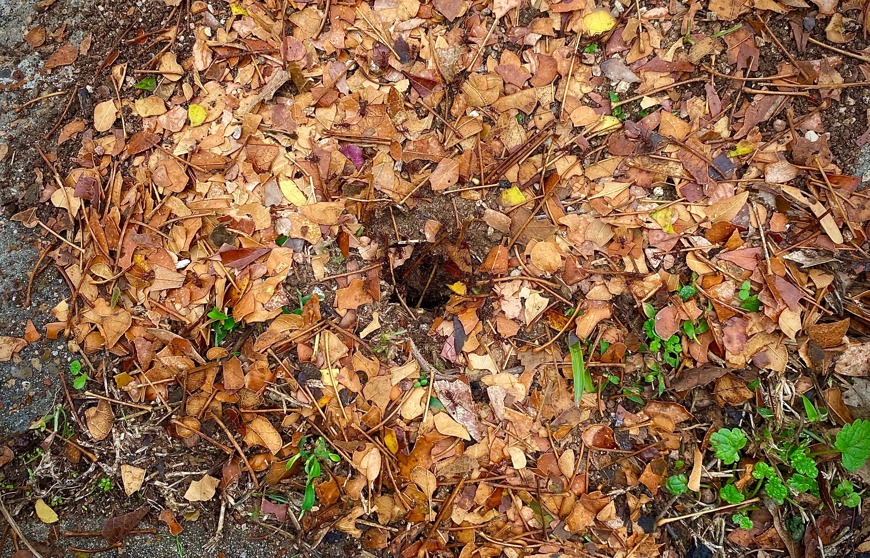 The leaves are not building material, but the medium from which the ants are growing a huge subterranean fungus garden, ruled over by a committee of underground queens. The main gate to their secret city is here, next to our neighbors’ driveway. With enough food, the colony could grow to as many as two million ants, in tunnels that sprawl across fifty feet or more, and feeder tunnels that reach ten times as far.