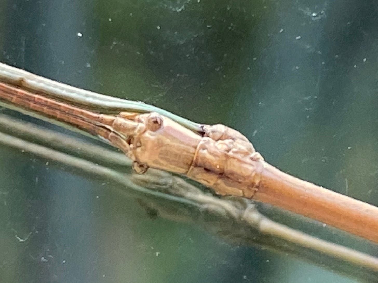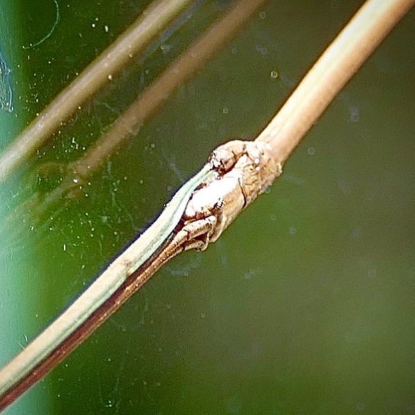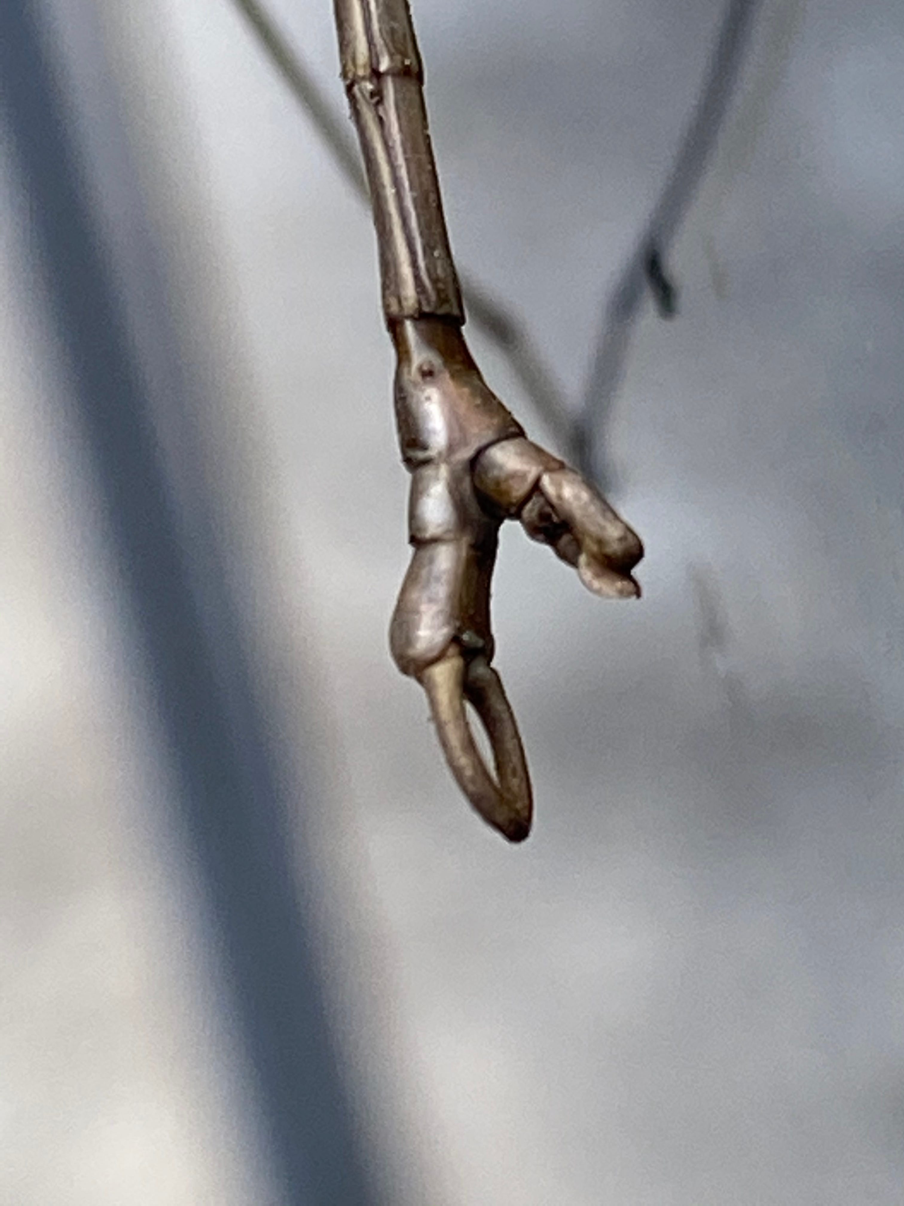 As I unsuccessfully tried to figure out which member of the Diapheromera family it was, here in the borderzone where many variants can be found, I became fascinated with just what a weird and wondrous creature it is, with antennae two-thirds the length of its body, forelegs that it rests against the antennae, perhaps as some additional camouflage, and a tail section that looks like a machine from some H.R. Giger fever dream: