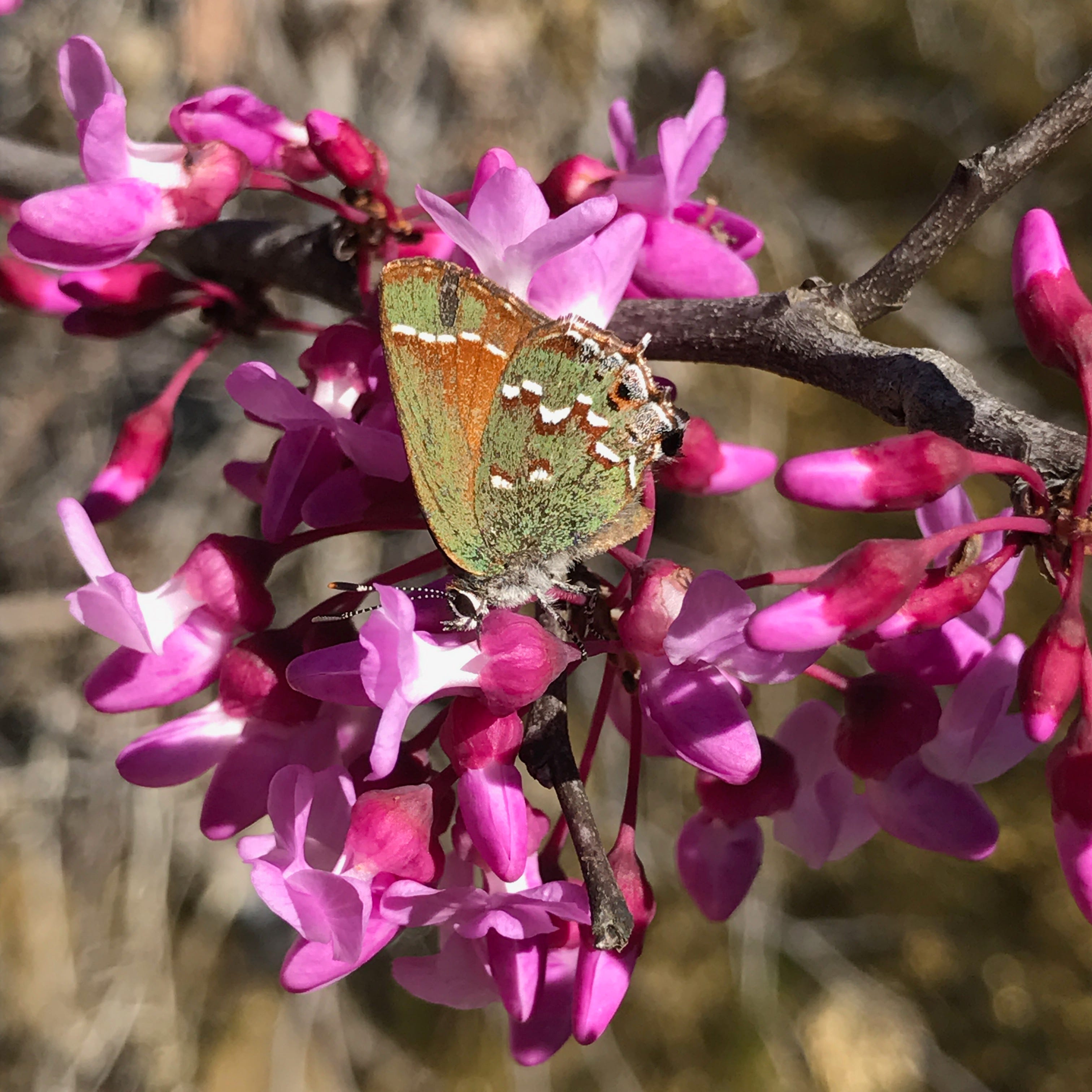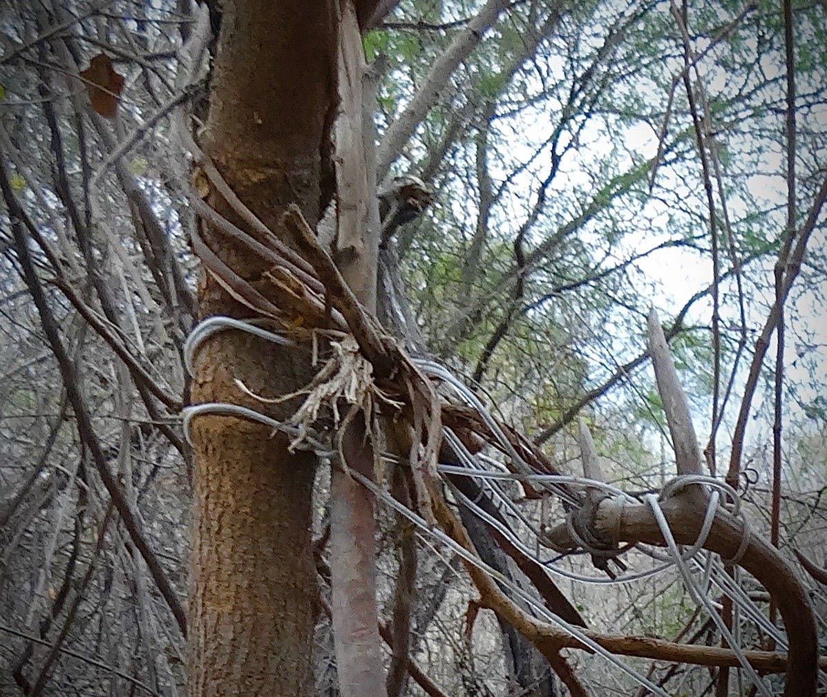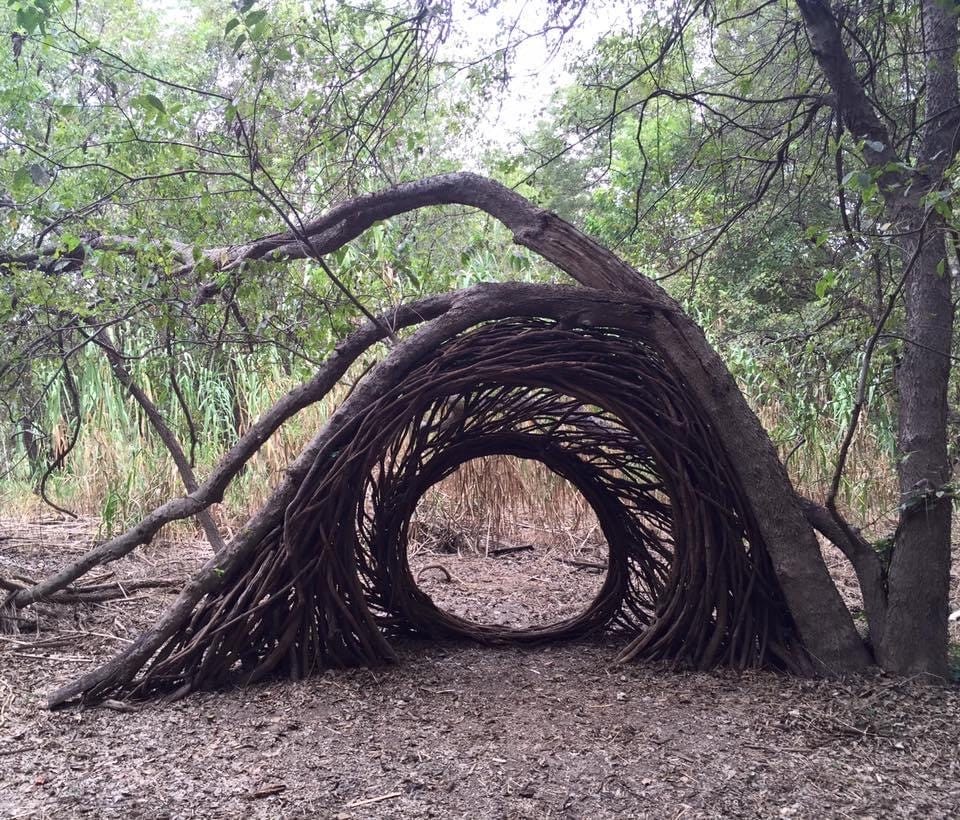 Five years ago yesterday I came upon this remarkable work of earth art—a neo-Druidic portal where the trail disappears down in the hole behind the dairy factory, made from a broken hackberry tree and artfully threaded strands of the thick mustang vine that grows gothic in these woods. With some detective work I was able to find and connect with the otherwise anonymous artist, Cameron Krow. For more of his amazing work, you can check out his Instagram or this show at the Harwood Art Center, though the works are best experienced as the unexpected encounters with the wild uncanny they so wondrously reflect.