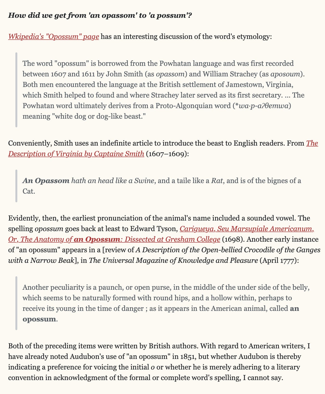 Writing this post, I disappeared into a different kind of portal, researching the correct article to use with the word “opossum,” which is generally pronounced in contemporary usage with a silent “o.” As expected, there is no definitive answer, but the entry on the subject at English Language Usage & Stack Exchange is a rich mix of etymological, natural and American colonial history (accompanied by troves of insane data, if you click through). Notably: