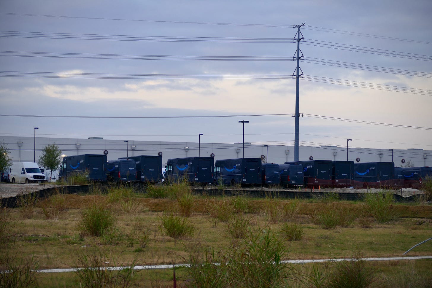 I wore a tweed jacket for this particular bit of early morning trespassing, made sure I had a few “Attorney at Law” business cards in my pocket, and thought about what my story would be if I ran into any security guys. I headed out right at daybreak, with the dogs. The site is almost directly south of our home, maybe two miles as the crow flies. It was an overcast morning, with dim light, and as I hoped there was only a skeleton crew in evidence at Amazon—just three or four cars in the lot, one semi unloading at an open dock way in the back, and empty Prime trucks lined up like planes on the deck of an aircraft carrier, resting up before Black Friday and the season of maximum consumerism.