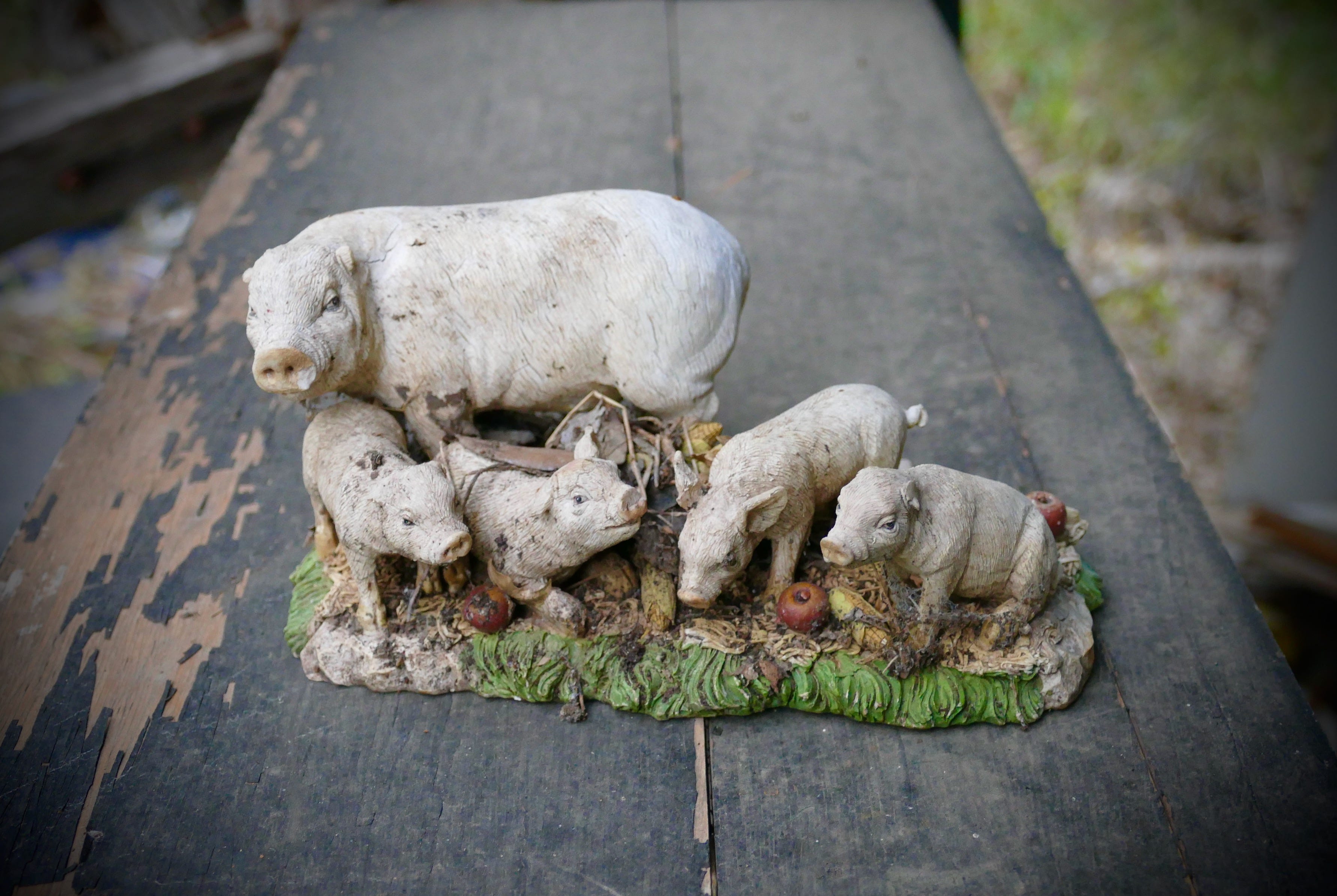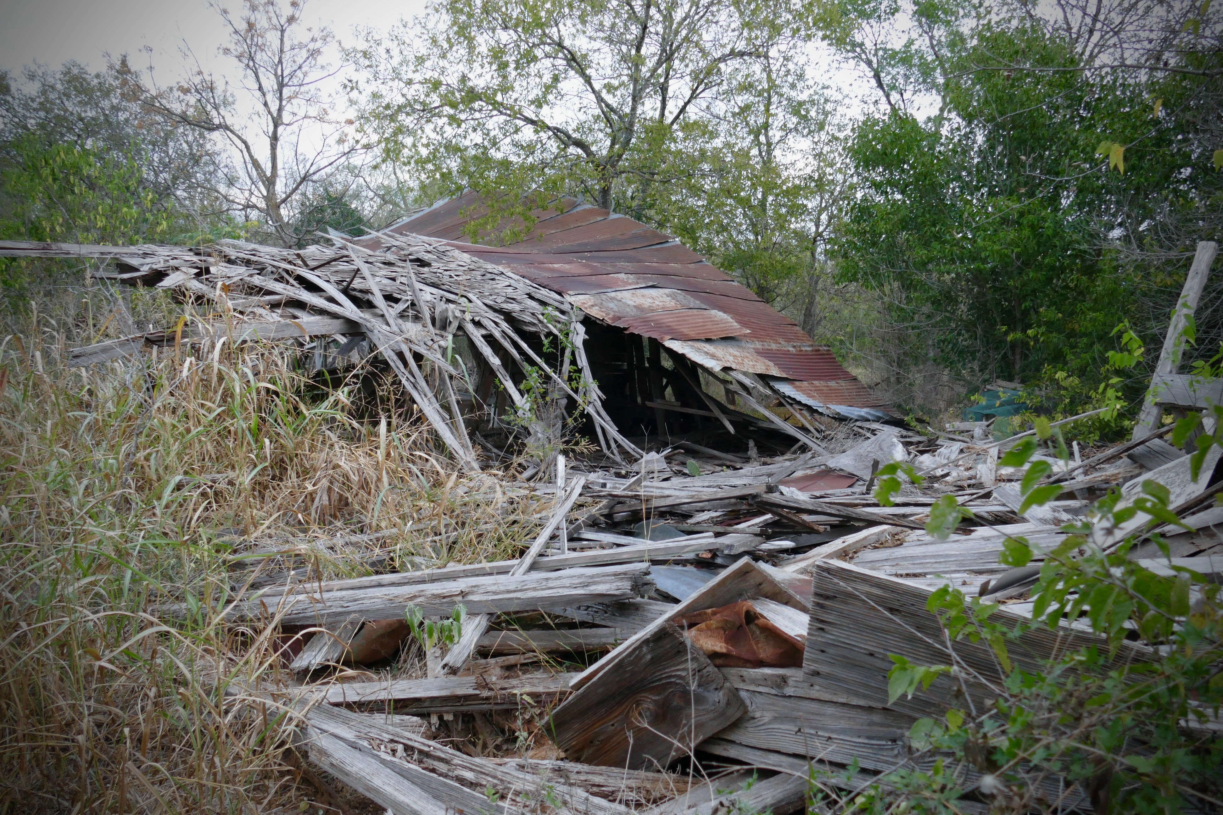 We found one shed that was still standing on four pillars, enough to have provided shelter not long ago to one or more people who were living back in there and left a massive quantity of found objects behind when they cleared out. Electronic devices long unplugged, overturned mattresses, a stuffed bear passed out in the field, a VHS tape of Yankee Doodle Dandy, and a figurine of pigs with apples that I regret not taking as a souvenir.