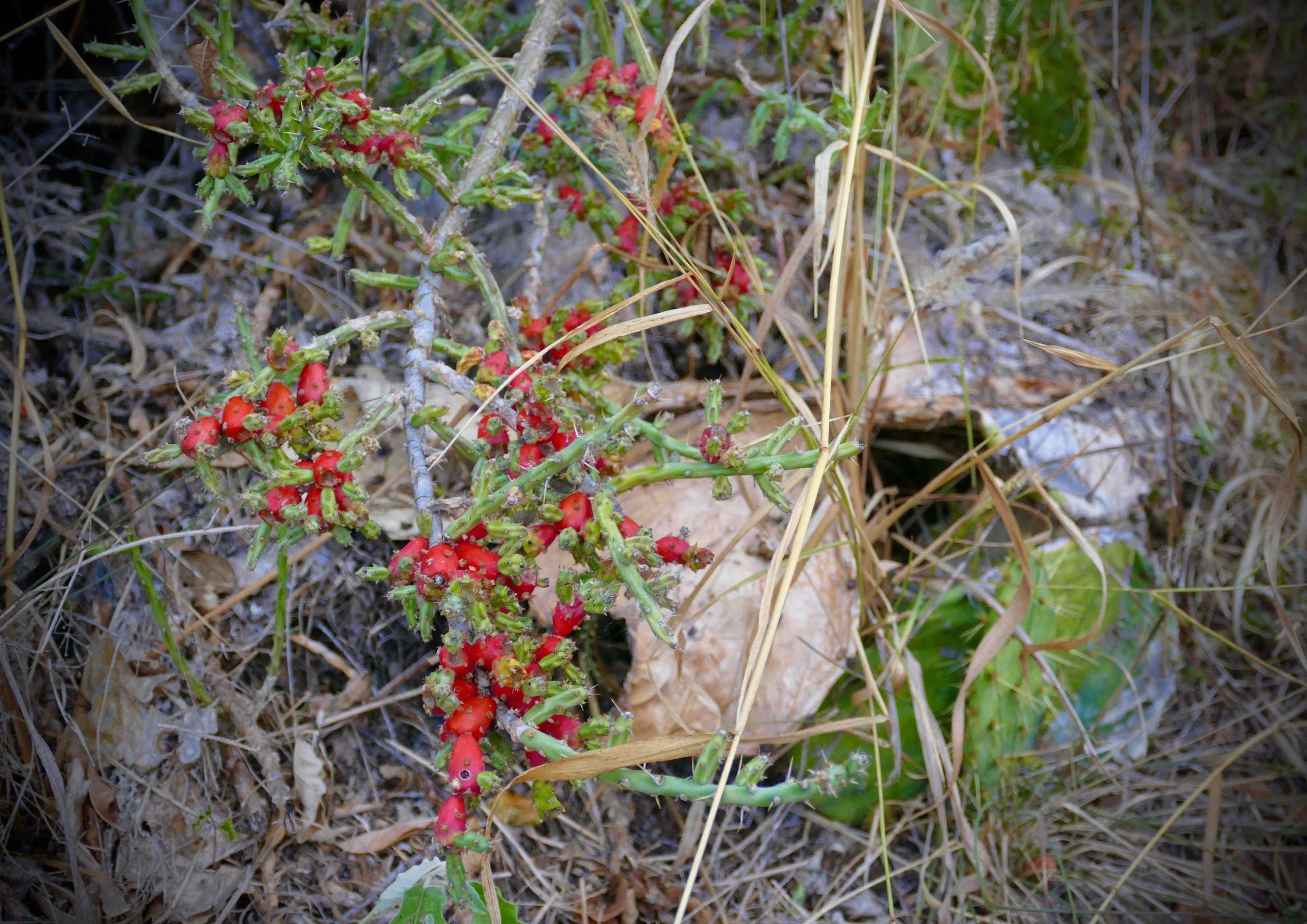 I didn’t see much sign of wildlife, though the dogs were pretty amped up at the scents on the ground. Mostly what I found back there was a cactus garden, where the old launch ramps and parking lots have been overtaken with diverse species of spiny plants. A remarkable number of pencil cactuses, big paddles of prickly pear, and large quantities of seasonally-appropriate tasajillo, the red-fruited cholla sometimes called Christmas cactus, which the foragers say makes good eating, if you can figure out how to handle it.