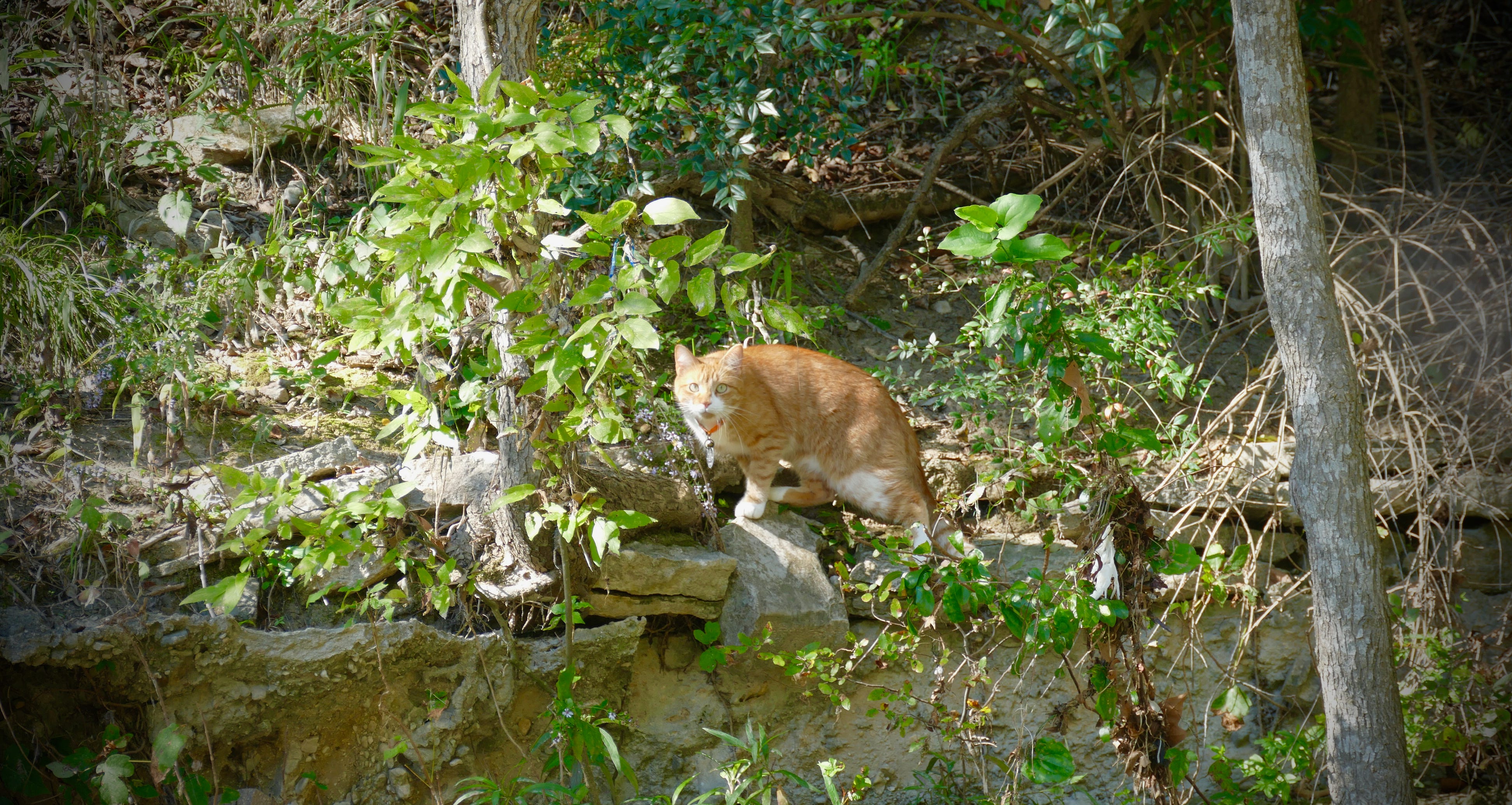 The creek was full of tracks, mostly raccoons and opossums. In one stretch you could see where the homeowners had built little retention walls from backyard landscaping materials and slabs of concrete, trying to keep the yard beneath their house washing away in the flood. There was one daytime predator in there, an orange tabby out stalking birdsong, trying to move slowly enough not to ring the bell on its collar. It scowled at me as I passed, with the eyes of the bigger cats that used to hunt our ancestors in the trees.