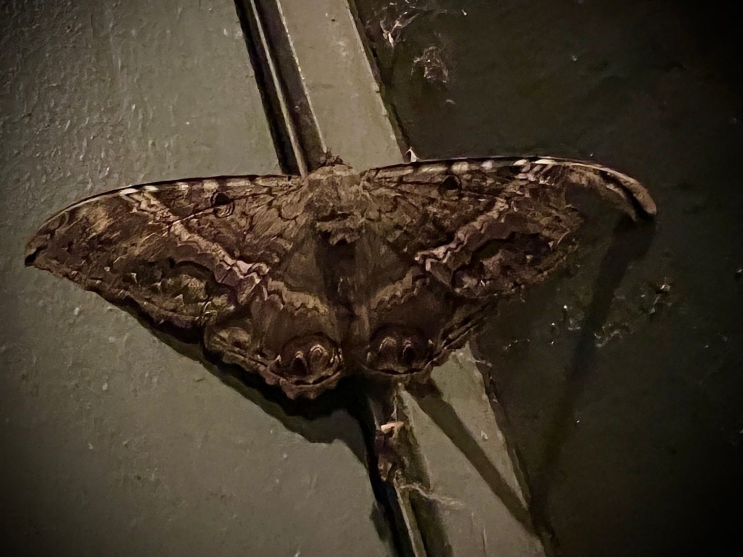 It didn’t look quite as dark now, but dark enough—the dark browns, mottled blacks and chalky whites of the woods at night, with an owl eye on each wing. It had a big chip out of its right forewing, one of those signs of life lived that helps you identify an individual insect when you see it again later. I admired its fragile majesty for a long moment, then entered the house through a different door.