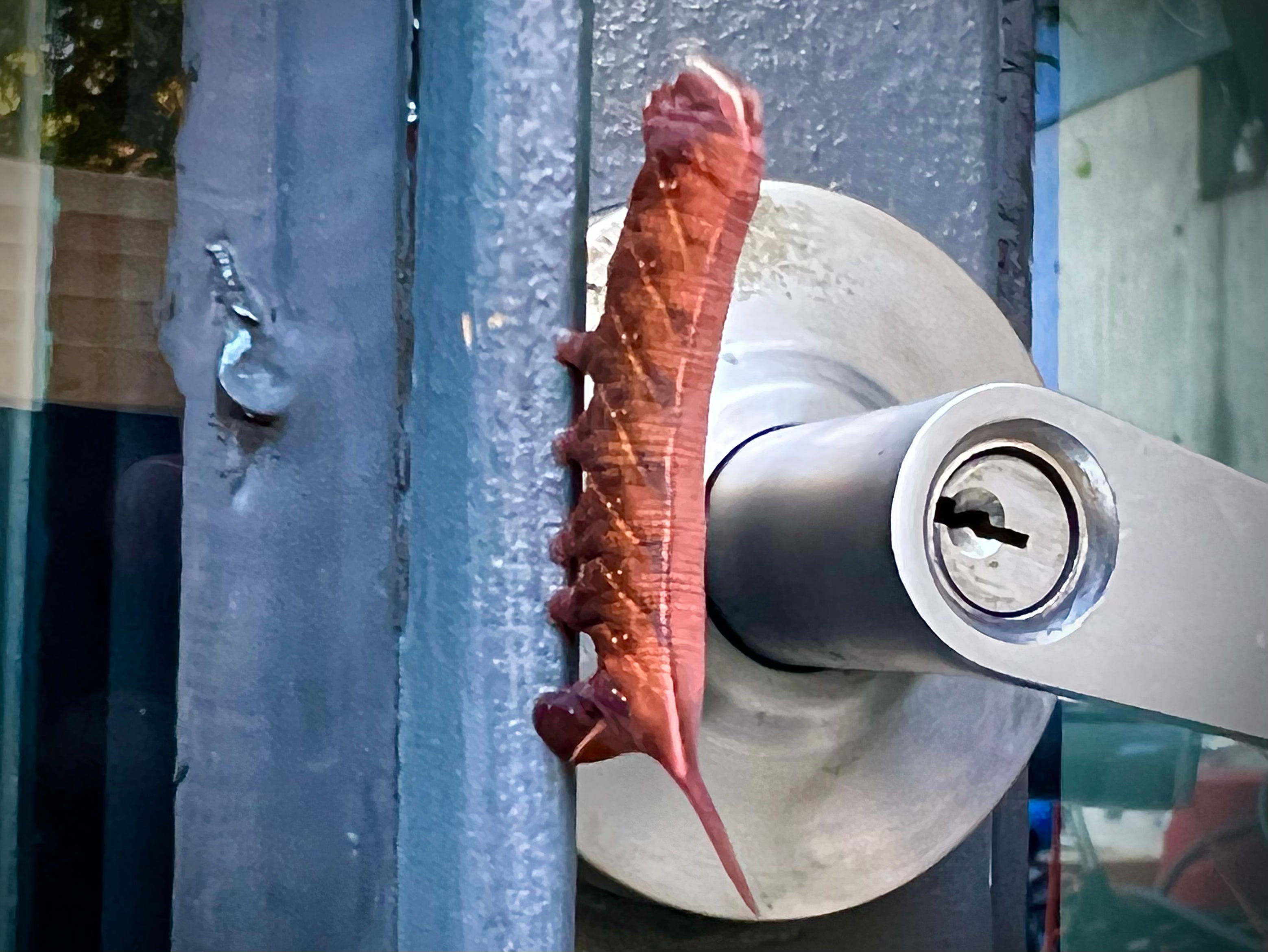 That night, I saw it again, on the seam of that different door. It was dark out, after we put our daughter to bed, and the butterfly was darker now. And again, I felt compelled to be thoughtful enough to keep it from entering the house, for fear it would end up trapped and without food but in a spot where we could not catch and release it. It was still there in the middle of the night when I had to get up, as the dogs went nuts over the sound of raccoons screaming in the trees.
