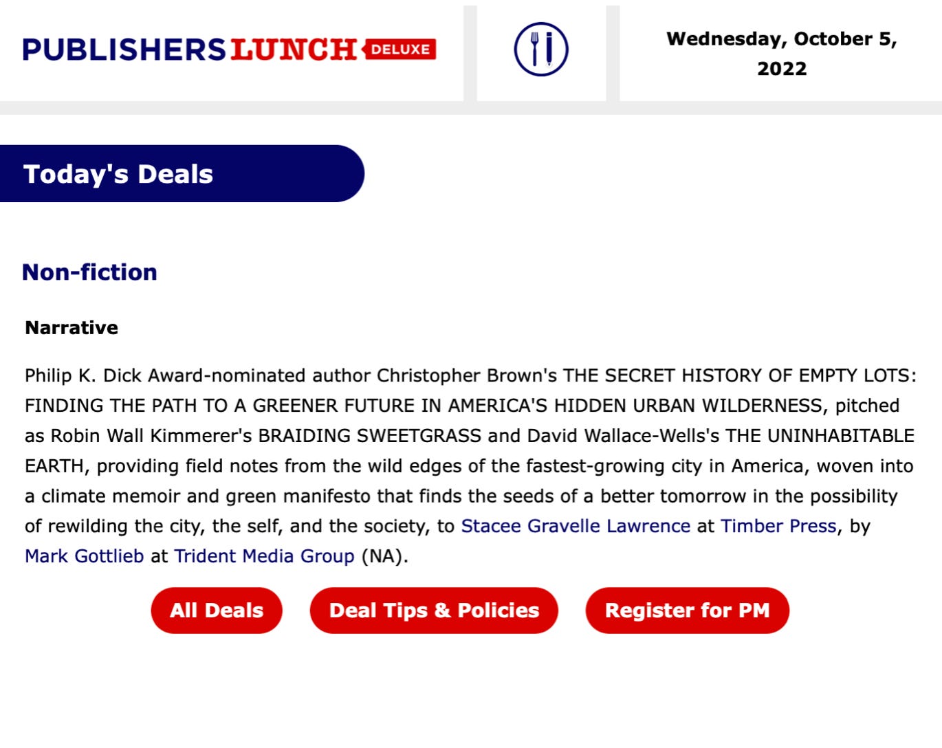 Here’s the deal announcement from Publishers Lunch, for those who like to read such things in their weird pitchspeak of the trade: