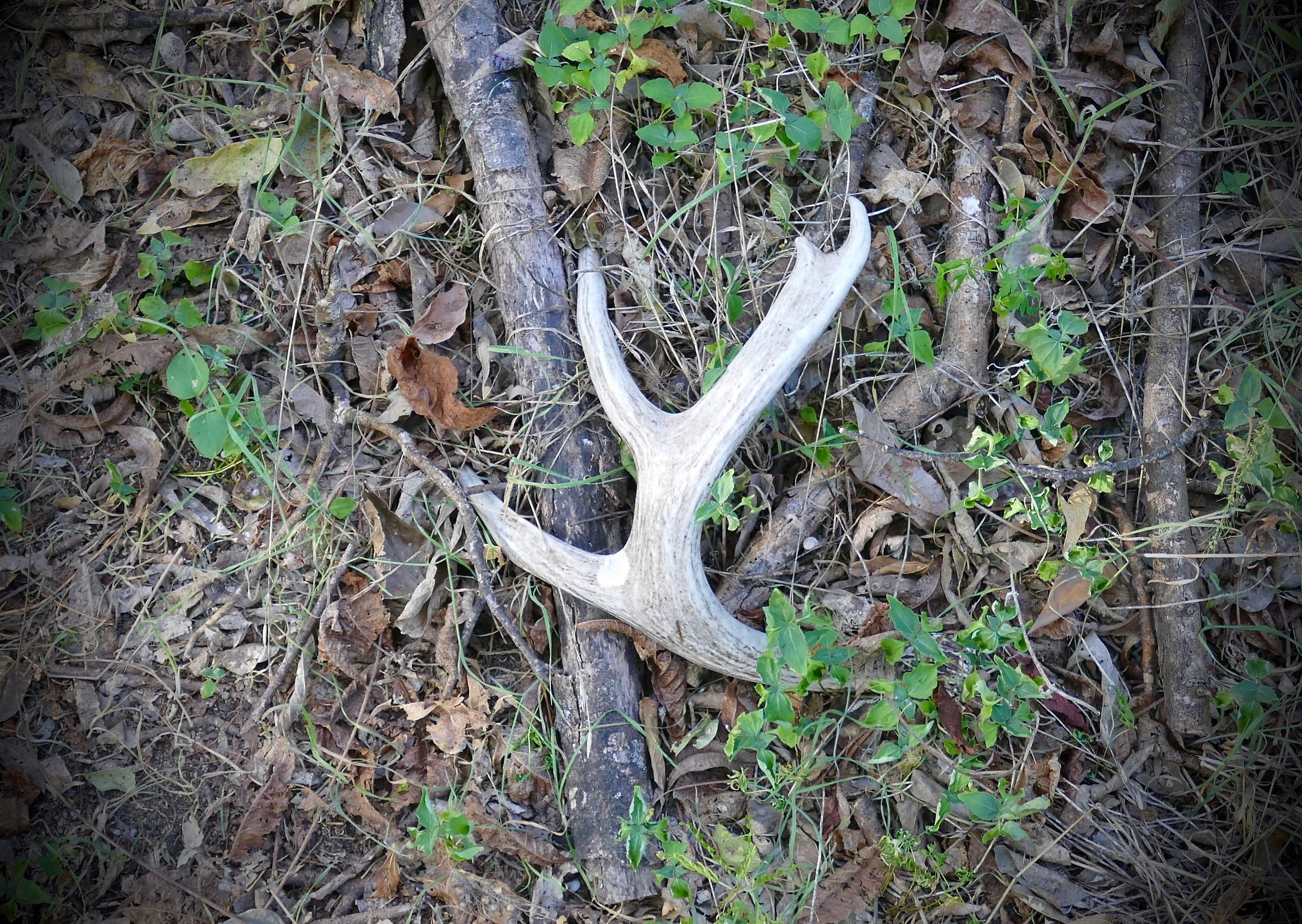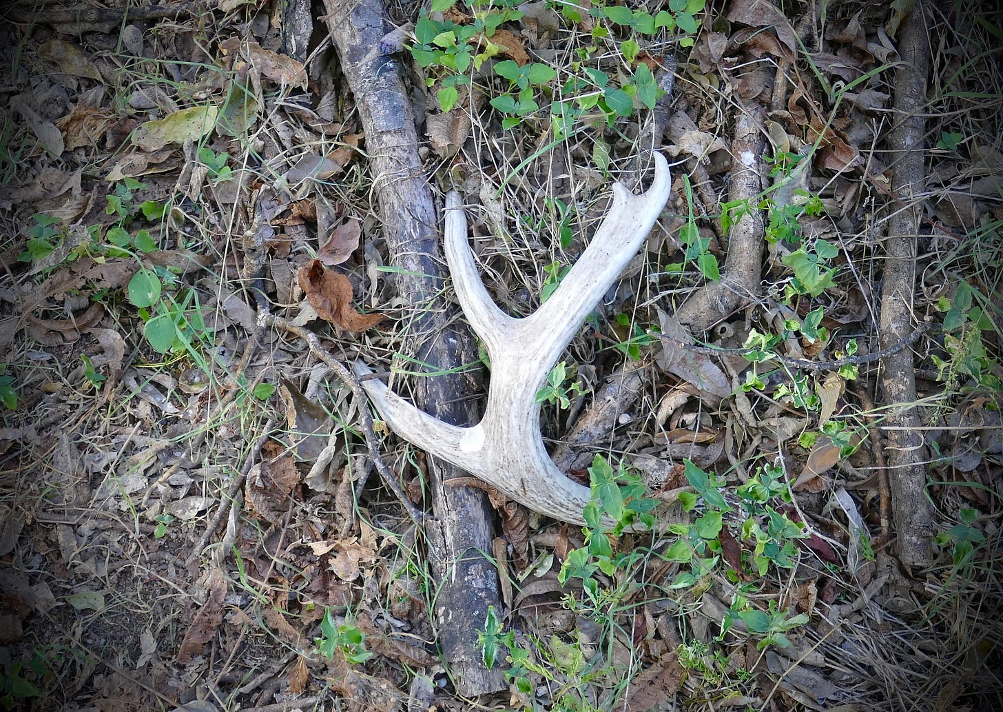 The Monday after my dad died, I was back home in Austin after spending most of the prior two weeks with him and my mom in Iowa, and I had a kind of surprise day off on what looked to be a beautiful day, so I took the black mouth cur out for a nice long amble into the woods behind the factories and back along the river. We hadn’t gotten very far before I came upon this antler shed, down in the ravine that runs behind the construction supply yard, a place where sometimes one finds the remains of old televisions. Antlers are always strengthening signs, and this one had a nice heft as I carried it all the way with me on our walk.