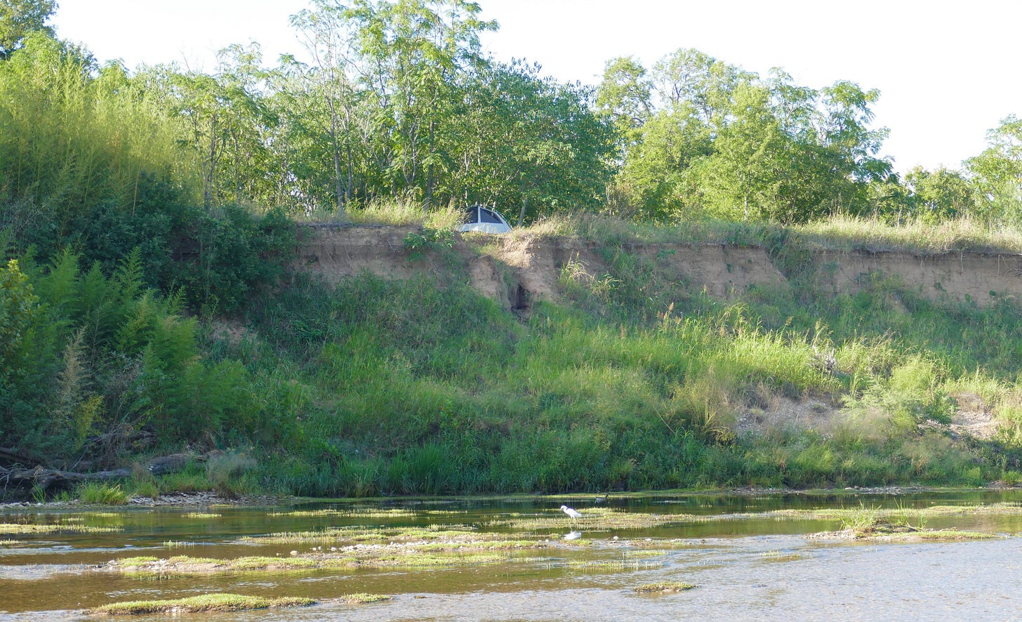 As the summer growing season has ended for the farmers downriver, the river authority has stopped its seasonal dam releases, and the channel is as shallow as it gets. Which is convenient if you are the sort who likes to walk in the middle of a navigable waterway whose banks are thick with vegetation and devoid of any trails beyond the sort that animals leave and humans have to crawl through. At the spot where the river widens and gets even shallower, a natural low-water crossing, we saw an egret, a mallard and a blue heron out for their morning feed beneath the edgeland tent someone had pitched in the woods behind the playground. I’ve seen a lot of such tents lately in the urban woods, tents that are obviously new and store-bought, by people who have enough money to make such a purchase—but not enough to put a roof over their heads in a town where the average rent is now $2900 a month, according to a story I heard on the radio this week.