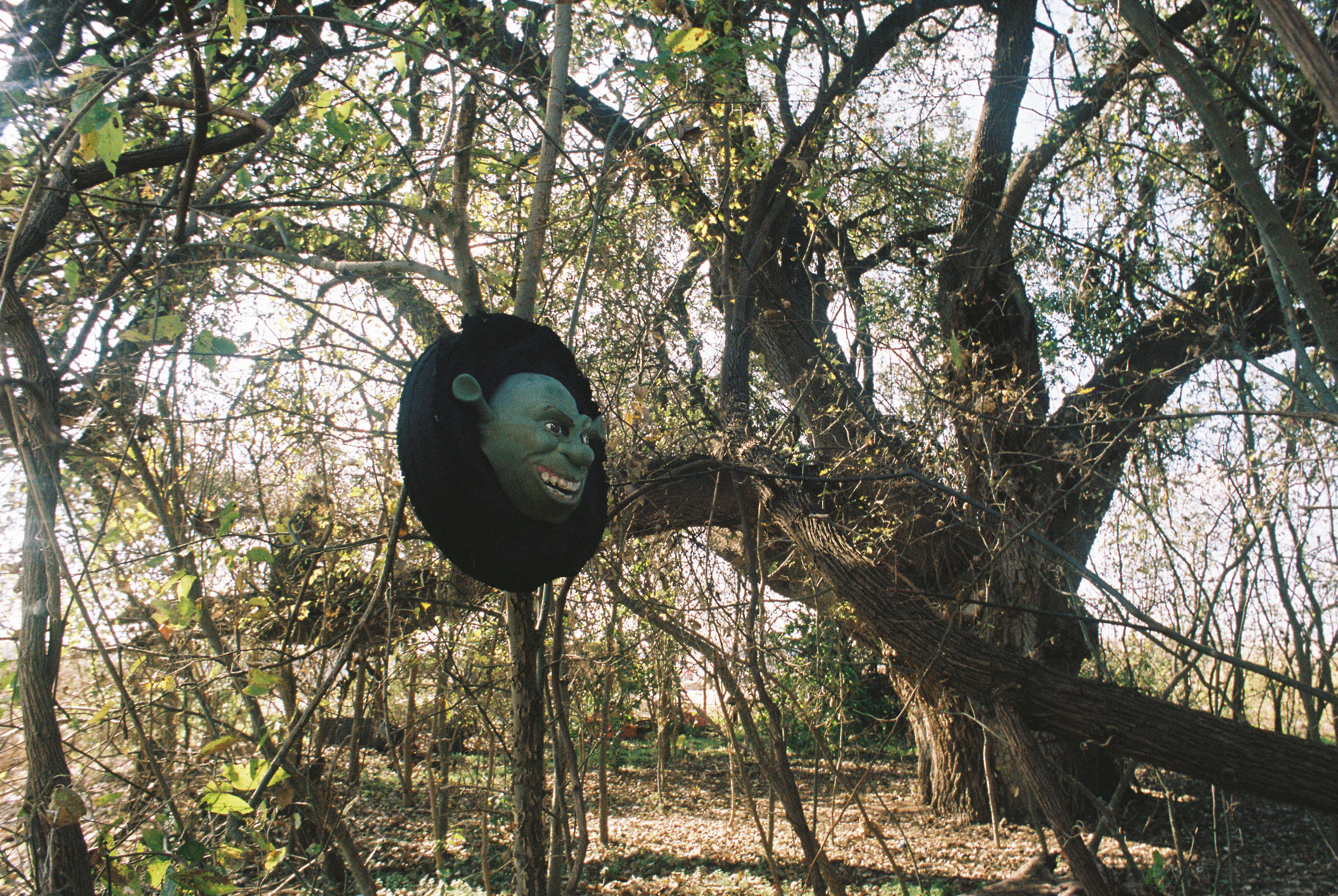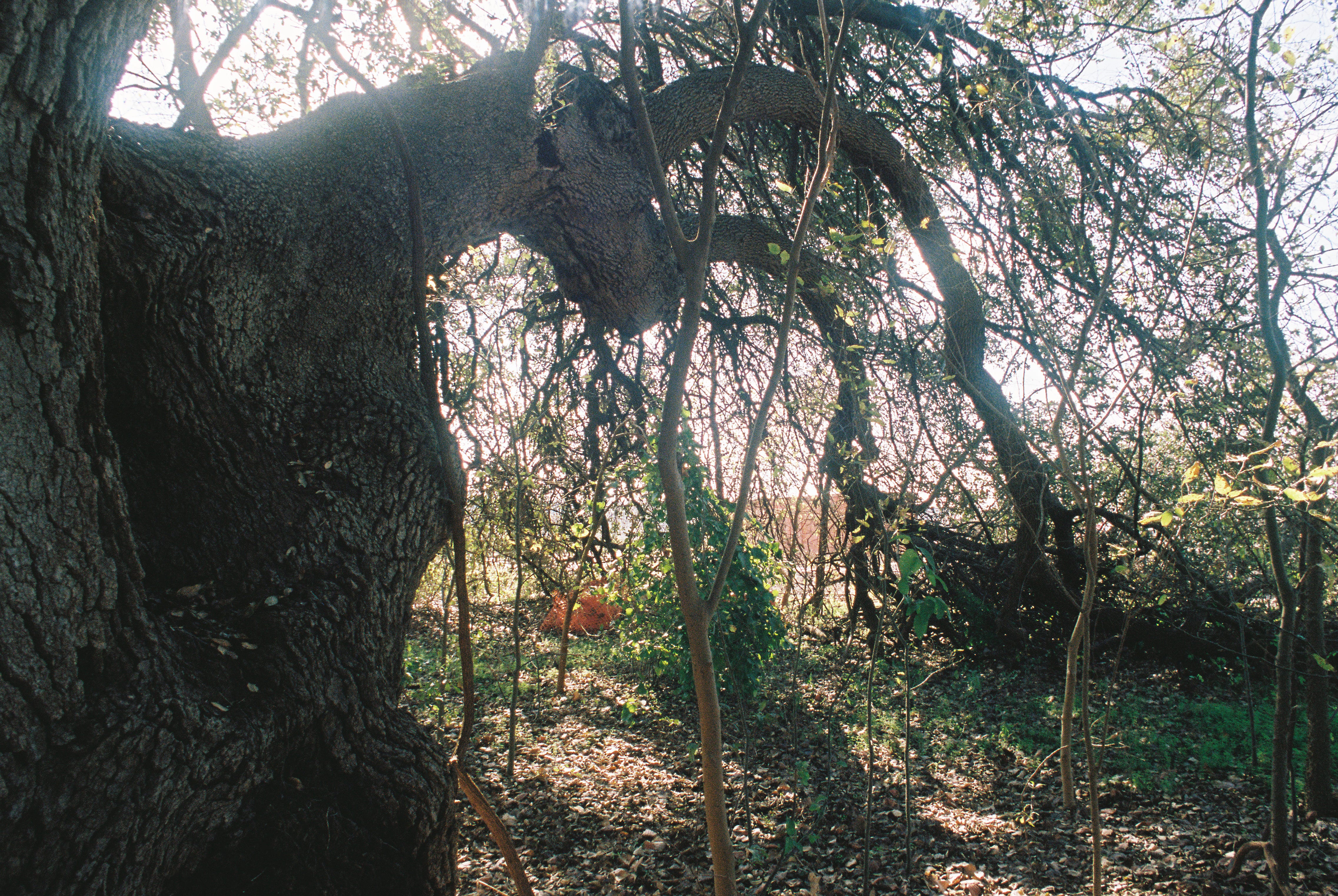 Phil’s squat is in a building that may once have been a single-family home along the side of the old road to Bastrop and Houston. If you drove past it now, you would be unlikely to notice it. It exists in a tiny sliver of urban negative space between the frontage road and a gravel mining operation, with big shipping containers stacked up as close to Phil’s main door as they can be without knocking his shack down. It may be that the only reason the little strip where his place is has not been razed is that it harbors a protected tree—a live oak that reportedly has the largest circumference of any in the county, and around which Phil has erected various talismans made from found objects reworked, as both welcome and warning.
