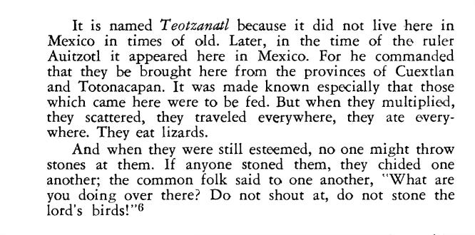 For more on the curious anthropogenic natural history of the great-tailed grackle, Quiscalus Mexicanus, check out Paul Haemig’s 1978 Biotropica paper “Aztec Emperor Auitzotl and the Great-Tailed Grackle,” and his 2012 piece in The Auk on the provenance of the historical account, both available at JSTOR. And for a more contemporary perspective on the charisma of the birds, see Austin writer Asher Elbein’s excellent piece at Audubon, “In Praise of the Great-tailed Grackle, A Bird That Doesn’t Need Your Respect.”