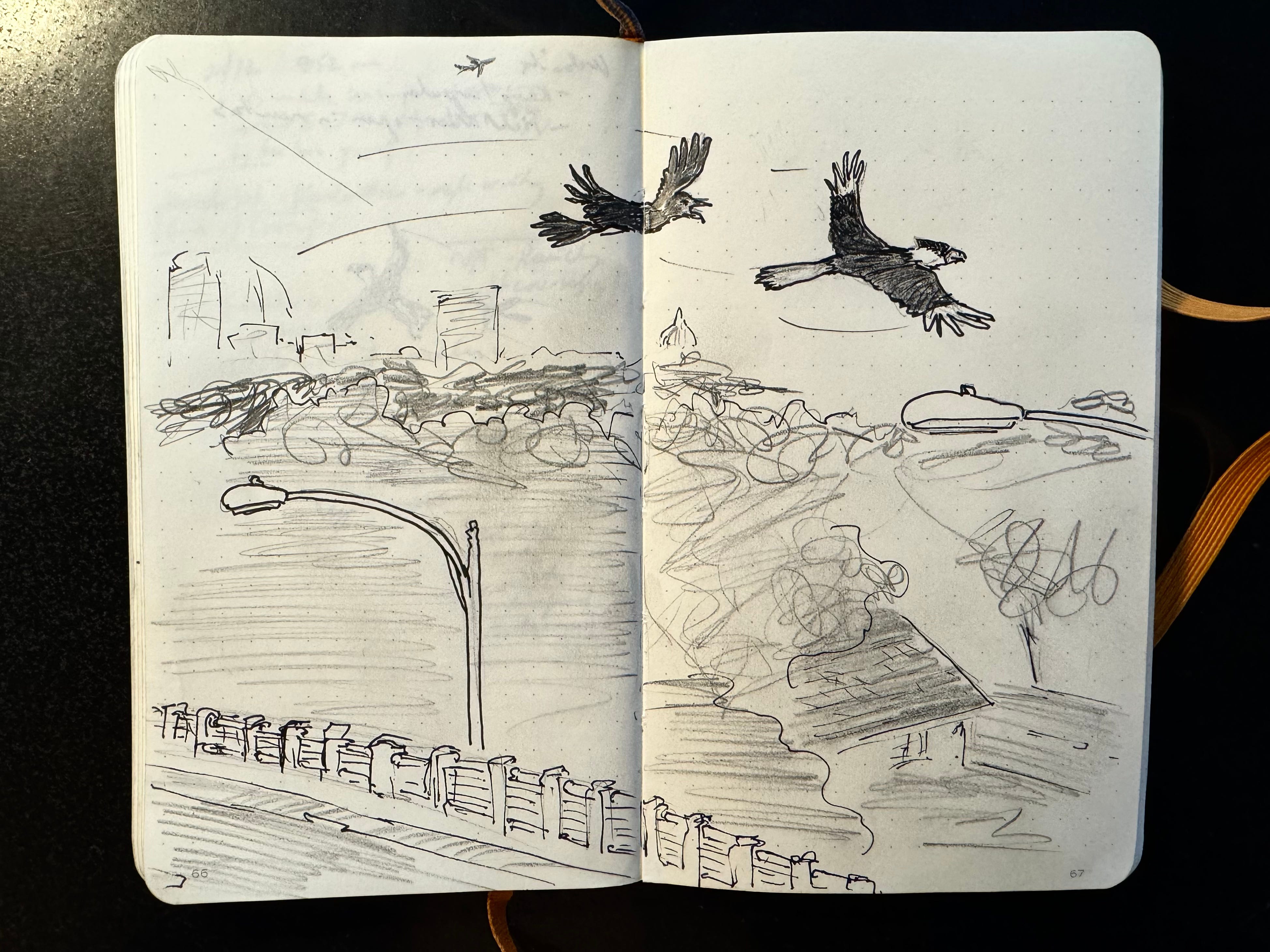 When I see bird mobbing in the city, it always makes me wonder where the nest is. Birds are good at hiding in plain sight, in densely urban zones like the one where I saw the morning rush hour showdown. The bridge I saw the birds from is pre-war infrastructure, passing over a freight line that’s probably been there for more than a century. Look down and you’ll see how tall the trees grow along the right of way, creating a little interstitial woods behind the municipal bus yard and the shuttered branch library, where the tall fences mostly succeed in keeping the people out.