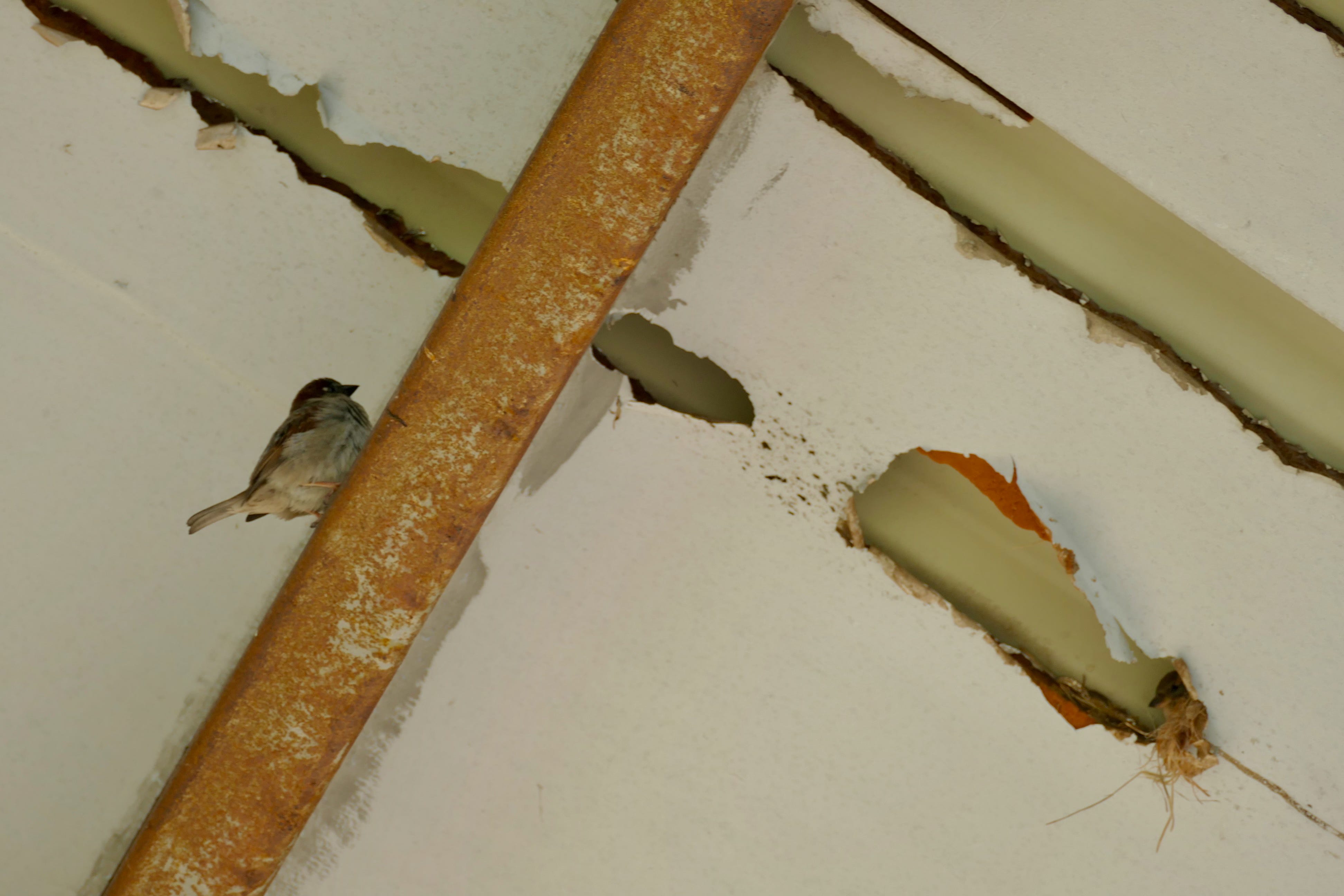 They actually live in the canopy itself. The corrugated metal roof is lined on the inside with some kind of particle board, which has begun to deteriorate in long holes that roughly track the lines of the corrugation in the metal panels. Providing perfect, sparrow-sized nesting spots. Big enough for a massive colony to fill the echo chamber with song, in a spot formerly filled with the reverse warnings of semi trucks.