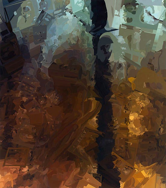 One of the enigmatic paintings my brother left behind was titled “Lost Planet.” The image has some of the intensity of the woods at night, a complex pattern in dark brown, a landscape layered over a portrait, with strong vertical dimensions and a sense, to me, of a portal that is open and yet impermeable. I don’t know what all the source images were that he layered into the piece. But I know the Lost Planet, because we visited it together. That was the name we 1970s Des Moines kids gave to an old dump site down by the Raccoon River that we used to explore, where the woods opened up to weird little mountains of luminescent industrial waste generated by the nearby water works. A place where the older kids would go to get high, and the younger kids would beam down from their imaginary starship. The Lost Planet is gone now, but I keep finding other places like it, here in these weird edgelands I like to explore. I took Alex to one, the last time he visited, and he loved it enough to make a joke about Stalker.