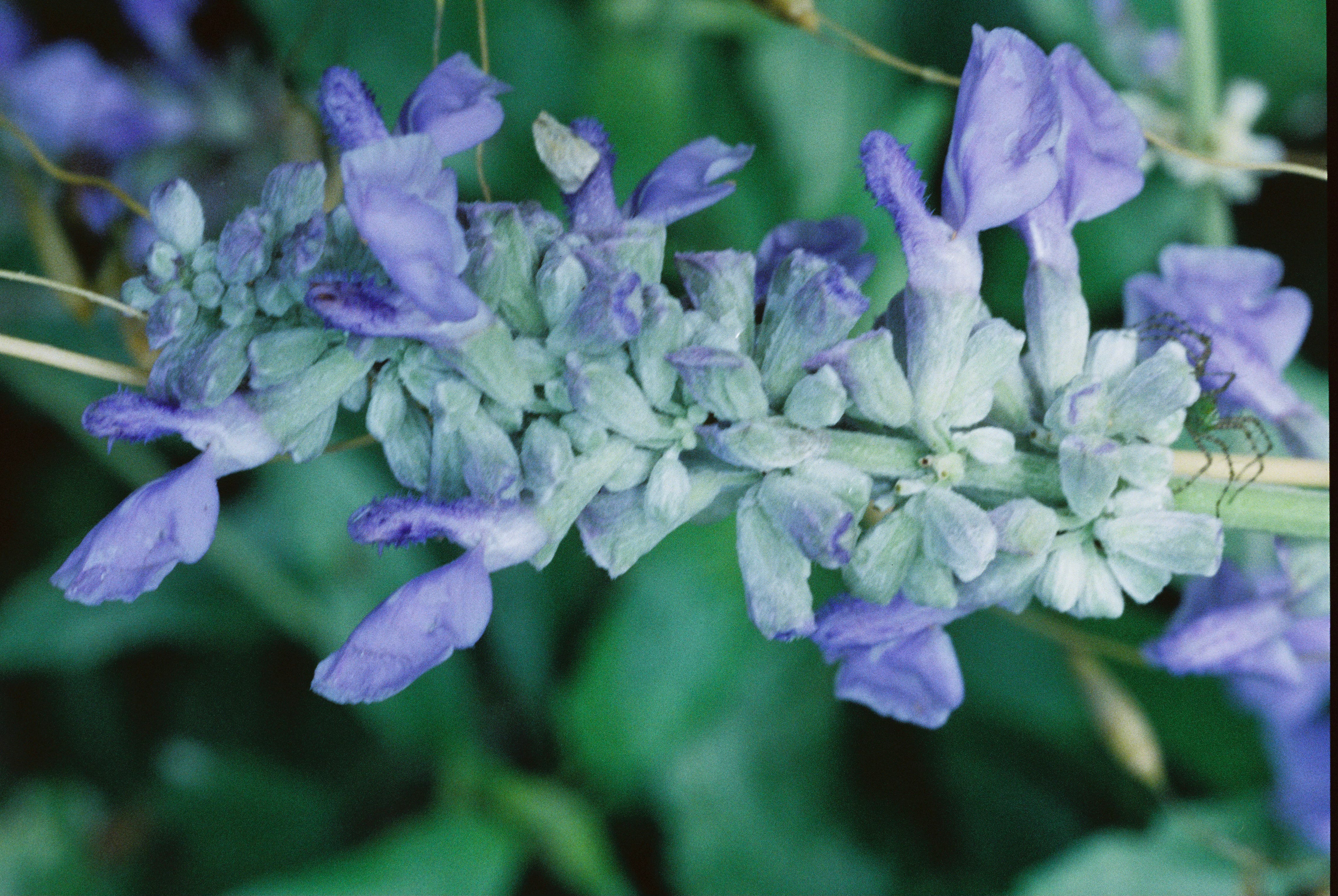 A close-up of the blue sage I found growing behind a shipping container, with a surprise green spider hiding there on the right: