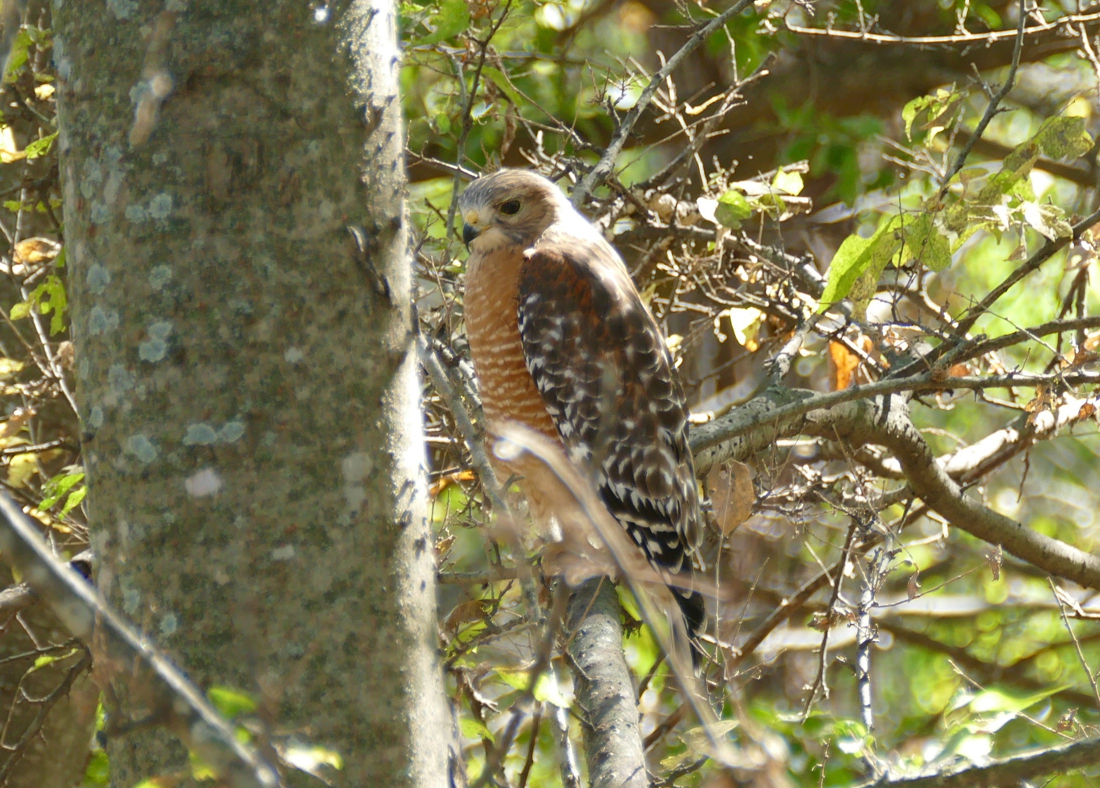 Wednesday afternoon I was walking toward the back side of the house to fetch something when my eye caught a spot of burnt orange in the browning-out palette of the urban woods. It was a chunky red-shouldered hawk sitting on the branch of one of the nearby hackberrys, watching the forest floor for prey. So well camouflaged, and at the same time so conspicuous.
