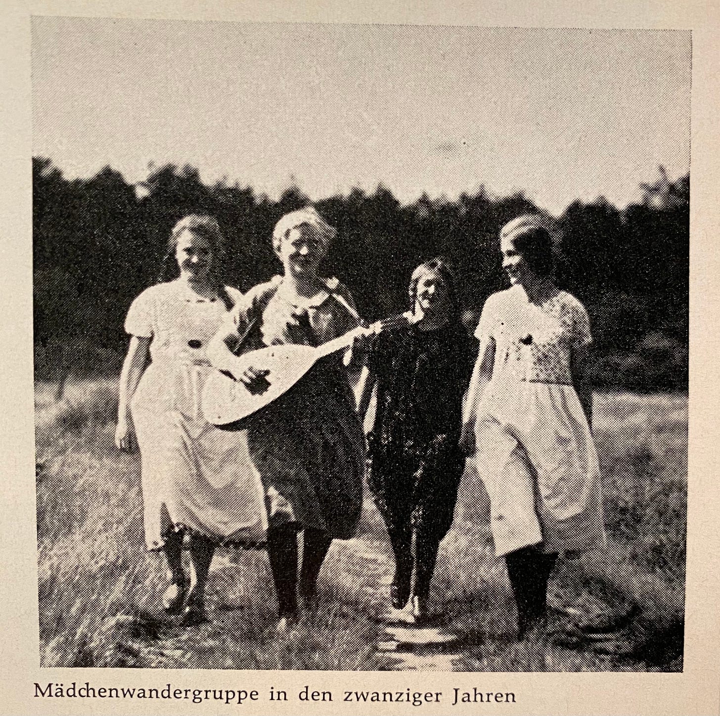 Around the time Robert Frost wrote his poem about fences in 1914, my grandfather was writing poems about the wonders of free roaming the Prussian countryside. One of my cousins in Hamburg recently sent me a poem Opa wrote in a letter to his sister in 1913, about fire dancing at a summer solstice campout outside Jena. Sonnenwende. It was only recently that I learned that in those innocent years before World War One, he was involved in the Wandervogel scene, a youth movement devoted to the joys of walking wherever you want to across the landscape and singing folk music as you go. I learned this after inheriting one of the instruments he used to play while wandering, a German lute like the one this lady is strumming: