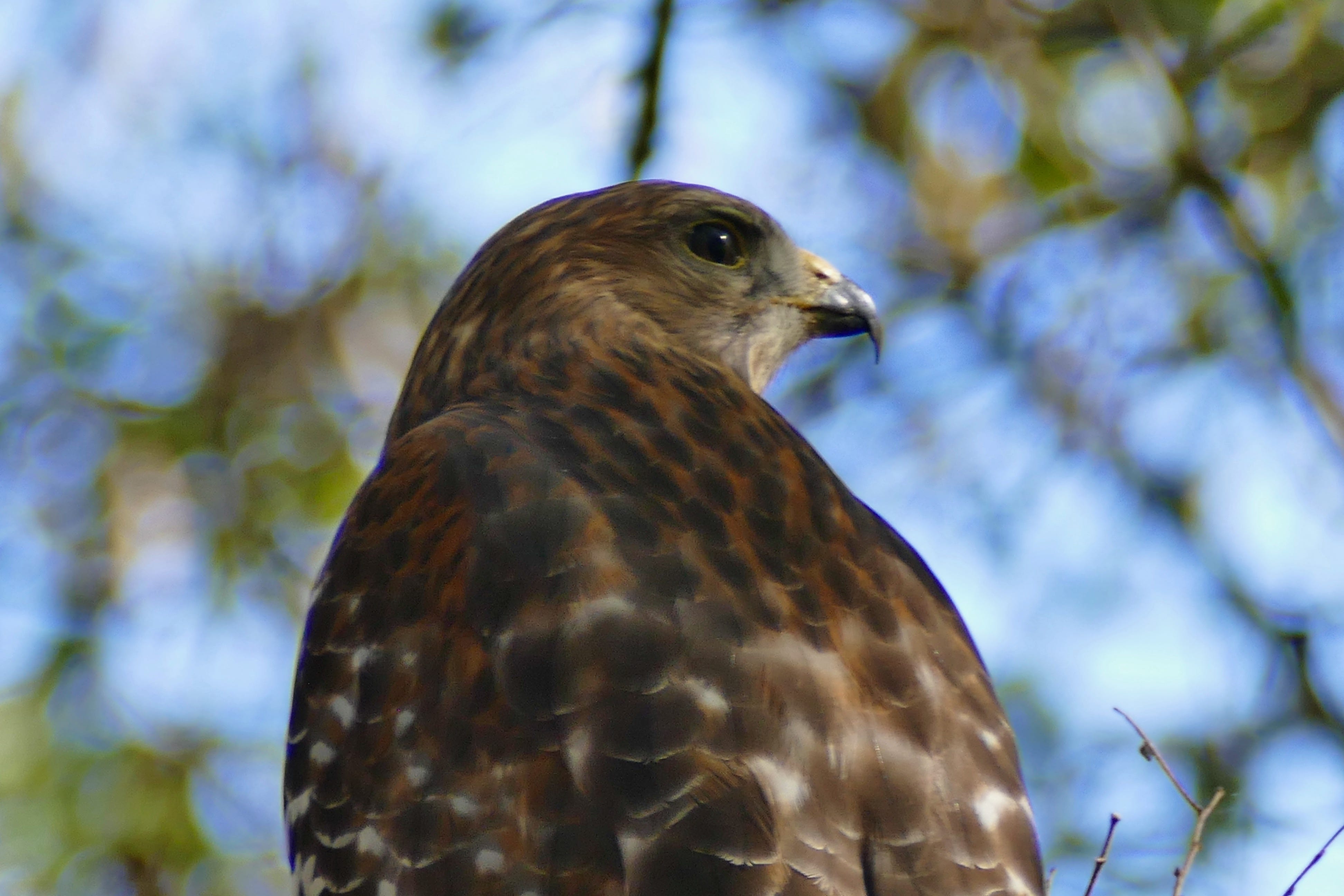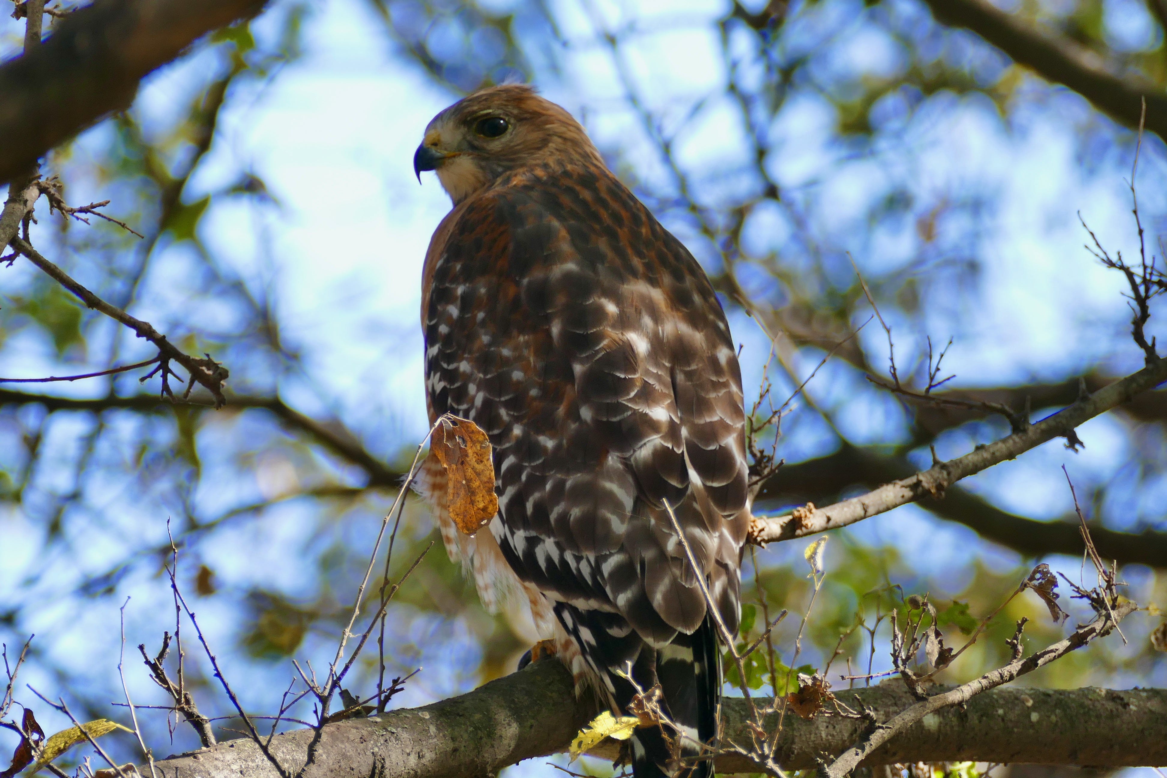 I had never really noticed the shoulders of a resting hawk, the way the whole beautifully feathered and insanely complex structure of its wings drapes over its back like the thick cape of some barbarian king. You could see how it was taking advantage of the lattice of shadows the autumn sun cast through the thinning branches of the woods, and how even its feather patterns mimic the way the light dapples through the foliage.