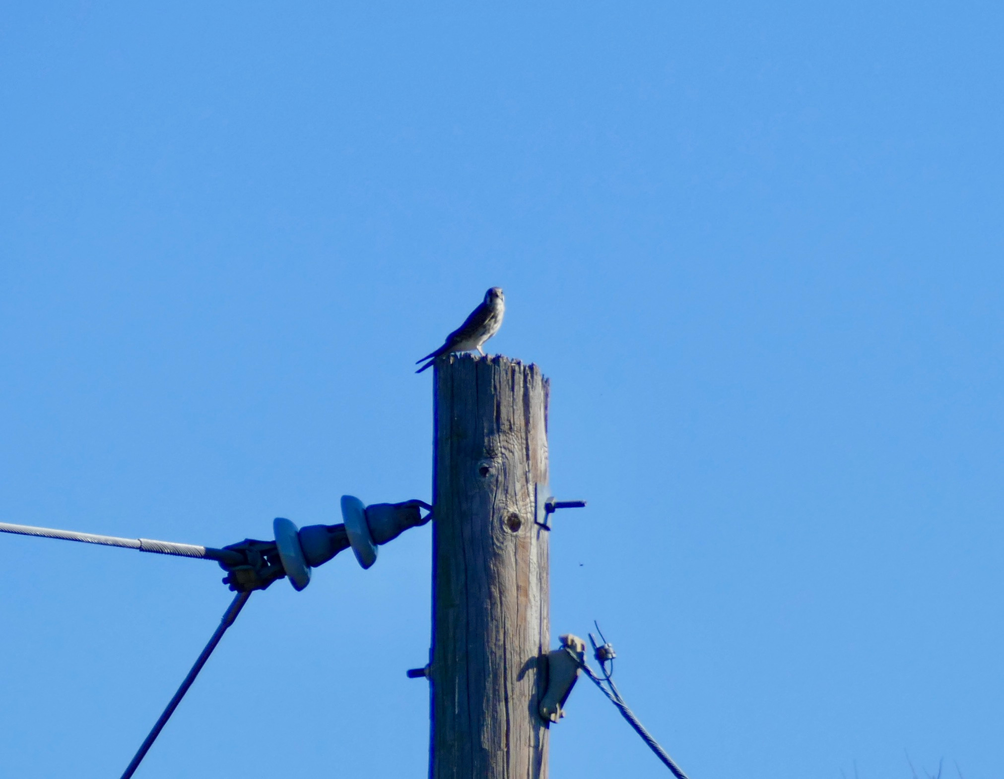 Like most rights of way that date back to the earliest parceling up of the county into private and public property, that roadbed is shared by easements for telecommunications infrastructure, and the raptors really love this one particular telephone pole that carries data for AT&T, Spectrum, and Google. It’s right there behind the door factory, the first pole after the lines leave the road and cut a path above a sloping field where the industrial park turns into a real park. It’s usually the red-shouldered hawk(s) I see perched up there when I step out of my trailer office in the afternoon, but on Thursday a smaller peregrine was on their turf.