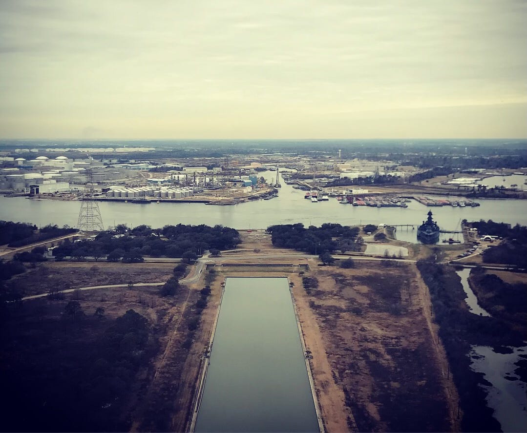Houston famously has no zoning, and has been in a state of more-or-less continuous industrial development since the discovery of oil at Spindletop near Beaumont in 1901 and the opening of the Ship Channel in 1914, which engineered Buffalo Bayou—Houston’s connection to the sea—into a channel capable of supporting the infrastructure of oil export and import. The result is a minimally regulated sprawl of massive installations along a 35-mile stretch of river, far too expansive to get more than a few glimpses of on a Sunday morning.