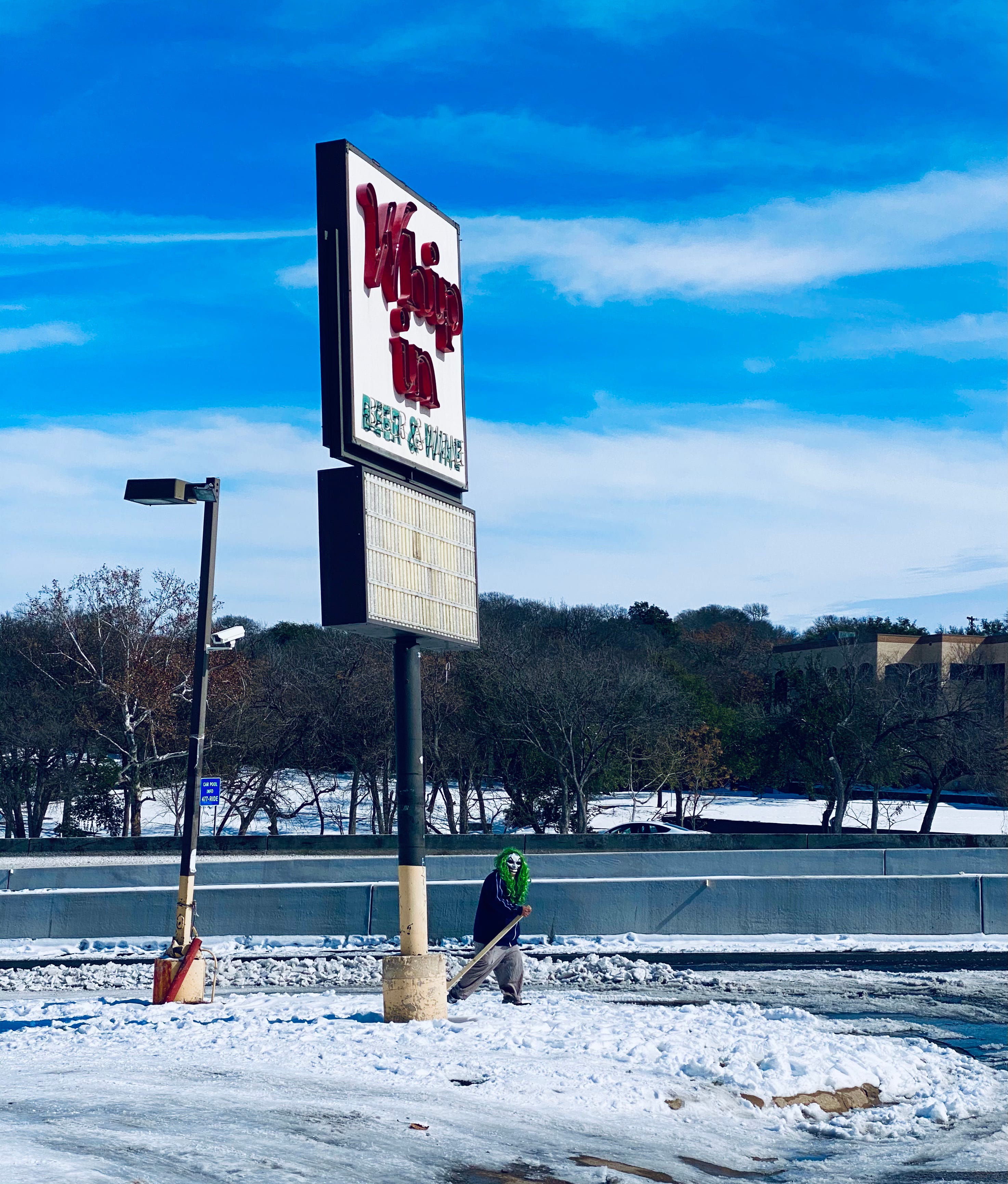 Adding to the weirdness was the ingenuity Texans displayed in figuring how to pull together some semblance of a winter wardrobe from what was in their closets. This frontage road prowler I spotted out foraging along the interstate Tuesday afternoon best embodied the spirit of our week, and I will be filing this image away for the next time someone asks me where I come up with the ideas for my dystopian stories of climate refugees roaming a ruined America: