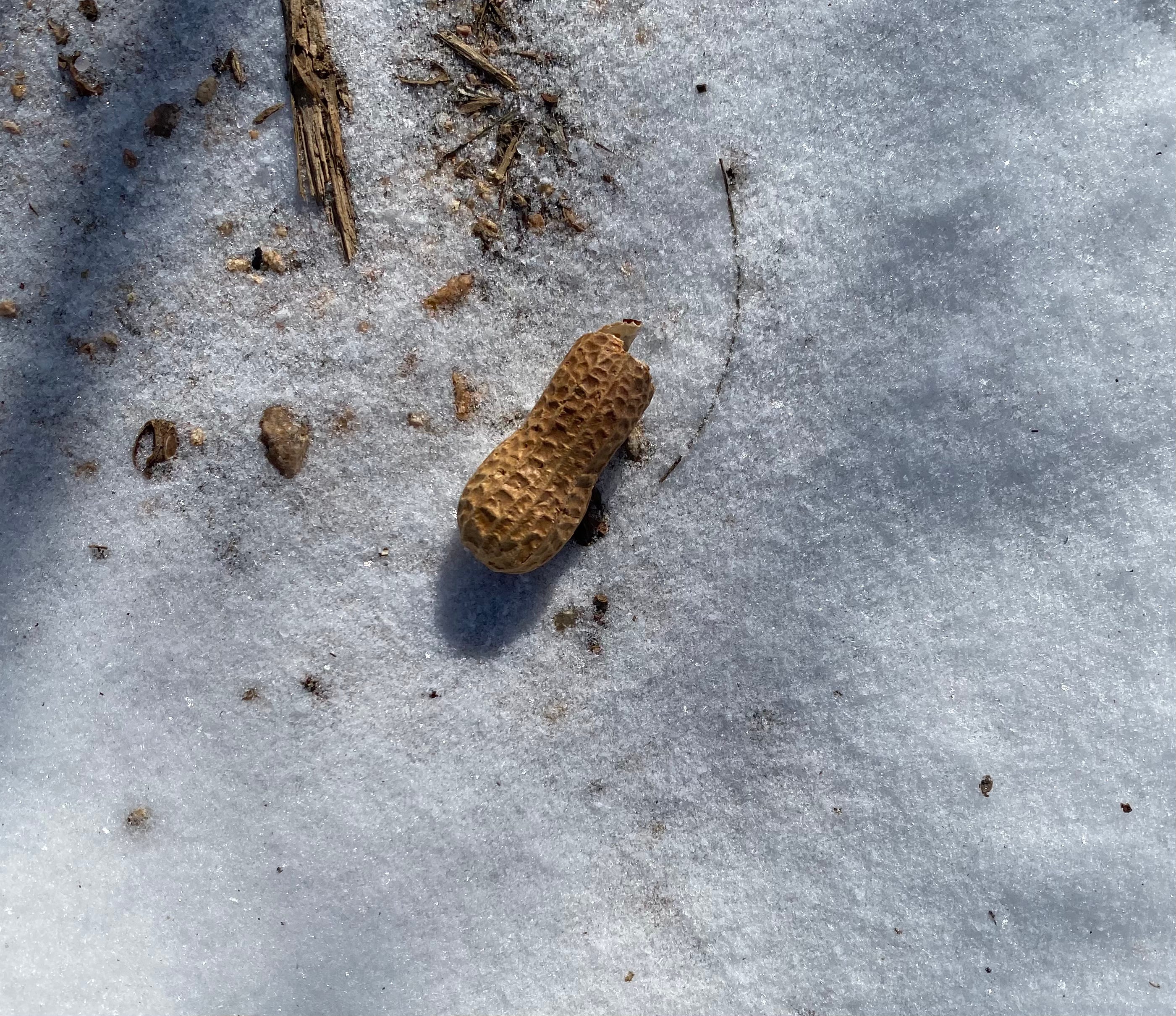 Upon my return from the woods that first morning I shoveled our patio, pathways, and driveway out, a job that took two hours improvising with a gravel rake and a shop dustpan (since you would never think to own a snow shovel in Texas), adapting bath salts and sandbox sand as ice mitigation, and even packing what snow I could up against our bedroom windows as extra insulation. And at the end of my labors, as I worked my way from the back patio to the street, I found a hilarious taunt from one of the monk parakeets who live in the always-toasty cell phone tower behind the 7-Eleven, a discarded empty from their seemingly bottomless supply of fresh peanuts, tossed on flyby the way the guys who work around here toss their tall boys after work on Friday.