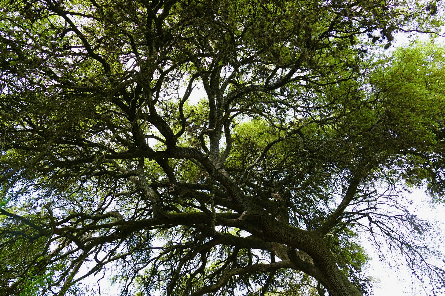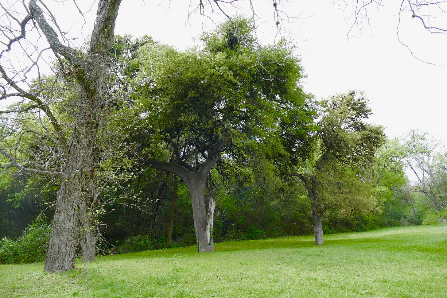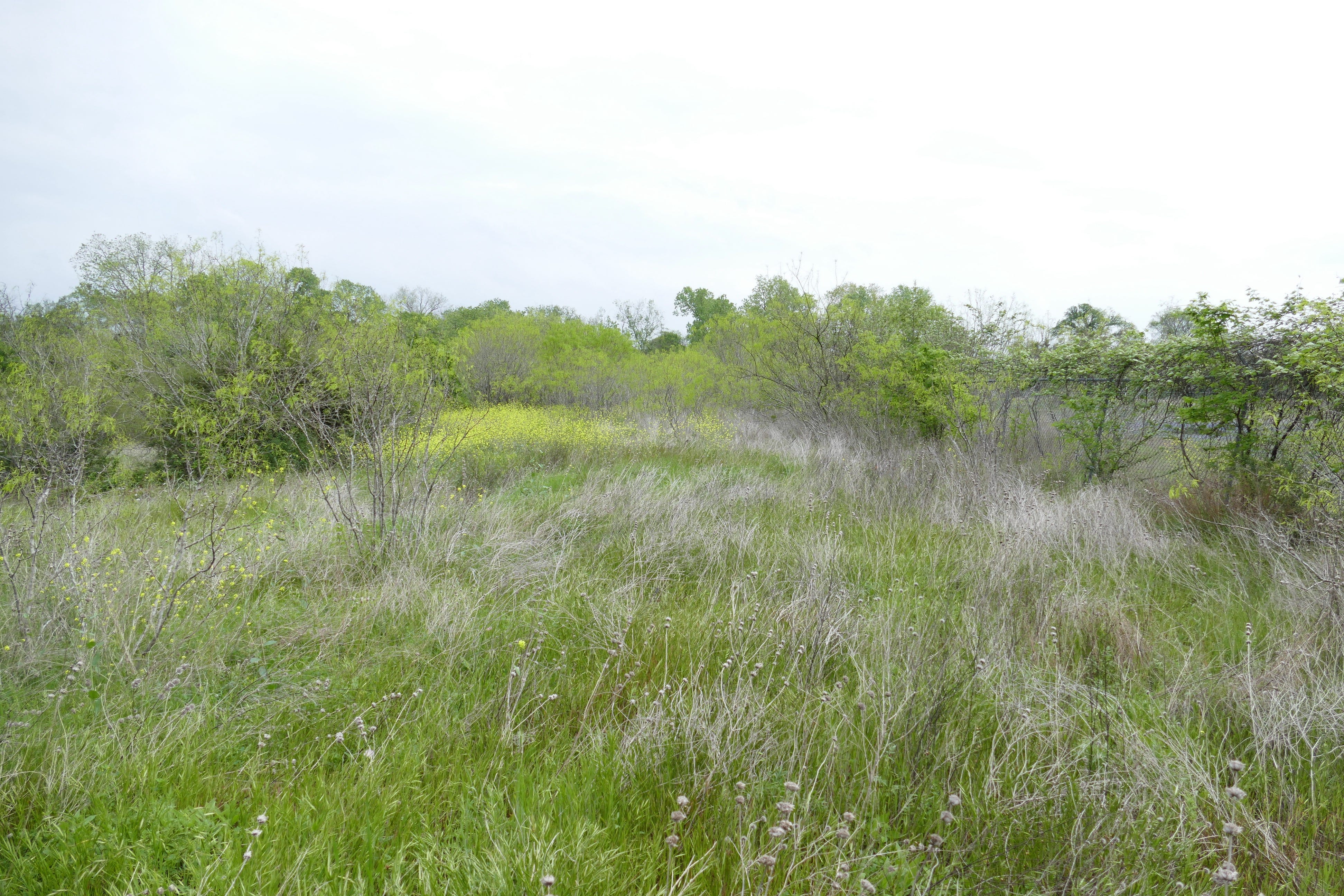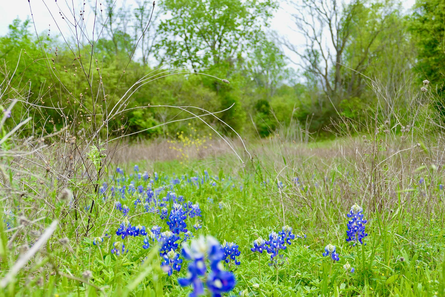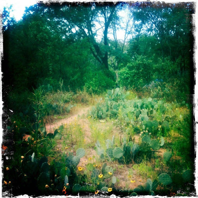 The bluebonnets were all in bloom back there, and big yellow patches of some weedy wild mustard. The primrose was still coming up, in thick green bunches. The field slopes down toward where I knew the creek was, in the stand of trees, but the foliage all looked too thick back there. After a few minutes, I saw I was on a freshly overgrown path, animal trail or desire path or both, and followed its traverse down the grade, passing a couple of big manhole covers embedded in the earth.