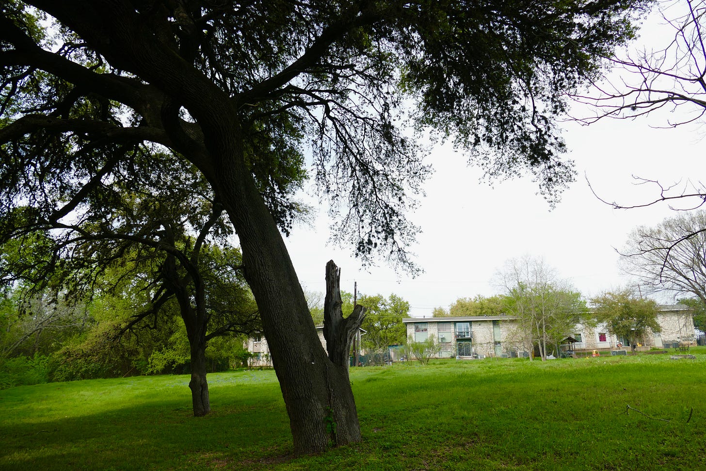 On the other side of the creek, not two minutes drive, but a distance that down in the creek bed could have taken two hours on foot or much longer for a mortally wounded naked man, I found the spot that had to be where they had found Wilbarger. A clearing there at the side of the creek, at the base of the hill where the old road still heads in the direction of Manor, under the shade of some tall majestic oaks, within view of the backyards of a run-down 1970s apartment complex not unlike the one we lived in briefly when I was a kid.
