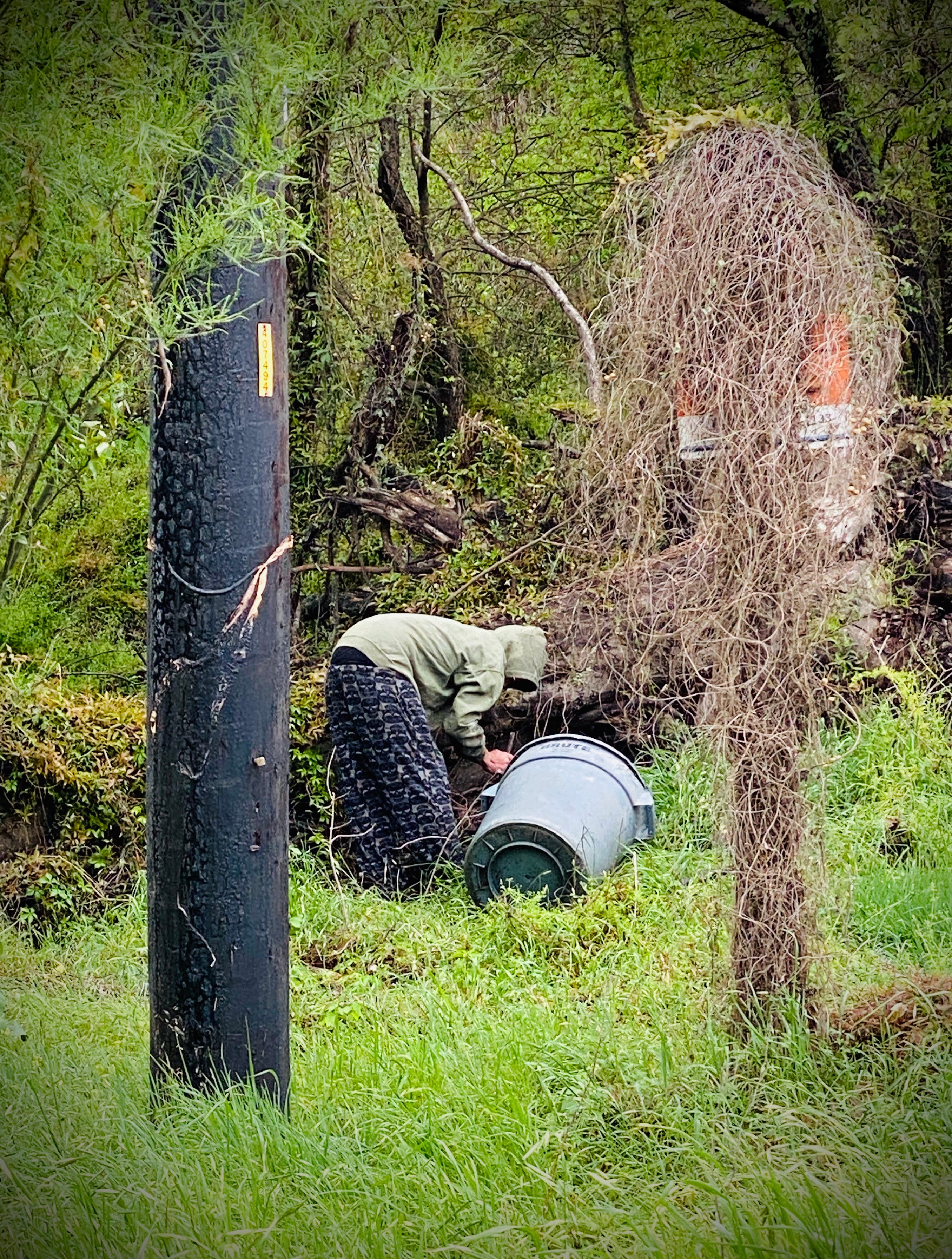 Friday evening, as I went for a run during a break in the rain, I saw my first real urban forager since the crisis began. The most common foragers one sees around here are the people who work the empty lots and medians for fresh pecans in the fall, and the homeless men who collect cans for cash. This forager was digging around at the edge of the cloverleaf under the old highway bridge, pulling something from under a fallen tree in the right of way where the buried telecom cables are marked. He had a big grey plastic trash bin, and no car in sight, down at the end of a road that’s closed for construction as they turn the old highway into a toll road. When I came back out of the woods, he was gone, and I saw that what he had probably been collecting was dry kindling. It was only the next day, when I looked at the pictures I had snapped for this journal, that I noticed his pajama pants were printed with black skulls.
