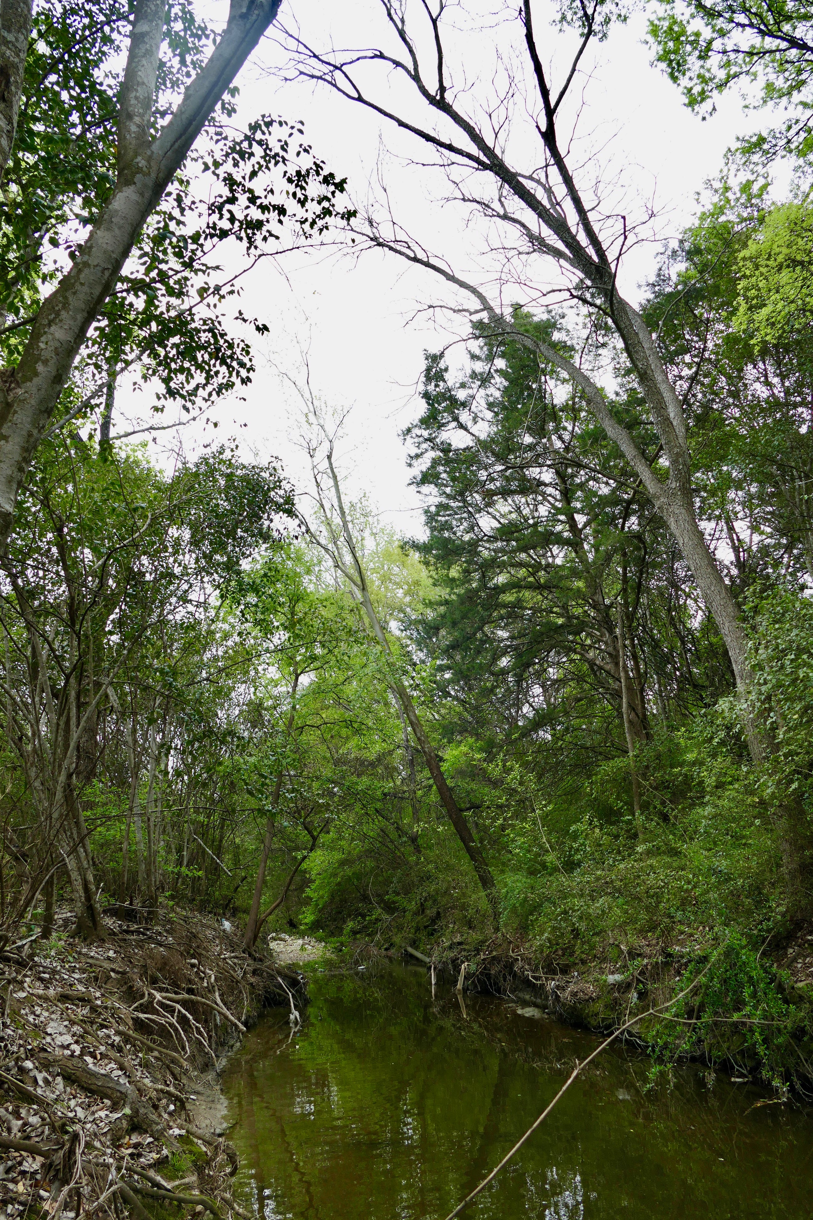 Urban creeks are generally pretty skanky, because most of what they collect is the filth we generate. The first thing I heard was the sound of a big turtle dropping into the water at my approach, and the first thing I saw as I looked at the water was a school of decent-sized fish. And on either side of the channel, thick stands of trees, the overstory dominated by tall skinny cottonwoods and one big cypress. There was trash in the creek, as there always is, and an old half-buried sewage pipe. But this was a place that had otherwise figured out how to mostly shut out human intruders. Every step required some variation of bushwhacker limbo, and the creek was too deep to cross without getting wet up to your knees.