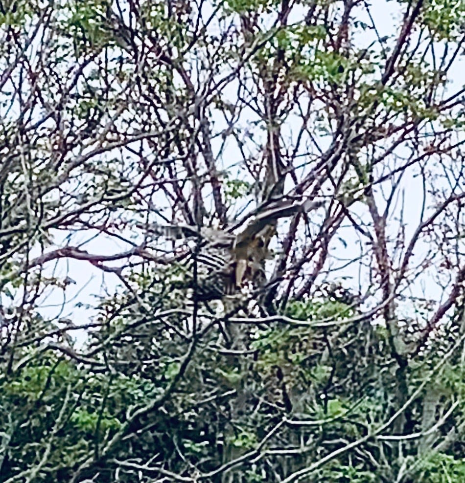 In other news, regarding the deserted traffic island I reported on two weeks ago, with the hawk nest in the tall trees between two onramps, I returned this week for a surprise: hawks with spring fever. I was jogging past just as the male swooped from behind the abandoned basketball hoop, flying crazy low to the ground, and then when I looked to see where he had landed, he had mounted the female in a bare branch. Sex with that kind of wingspan looks challenging. And the hawks looked like they didn’t want an audience, so I moved on.