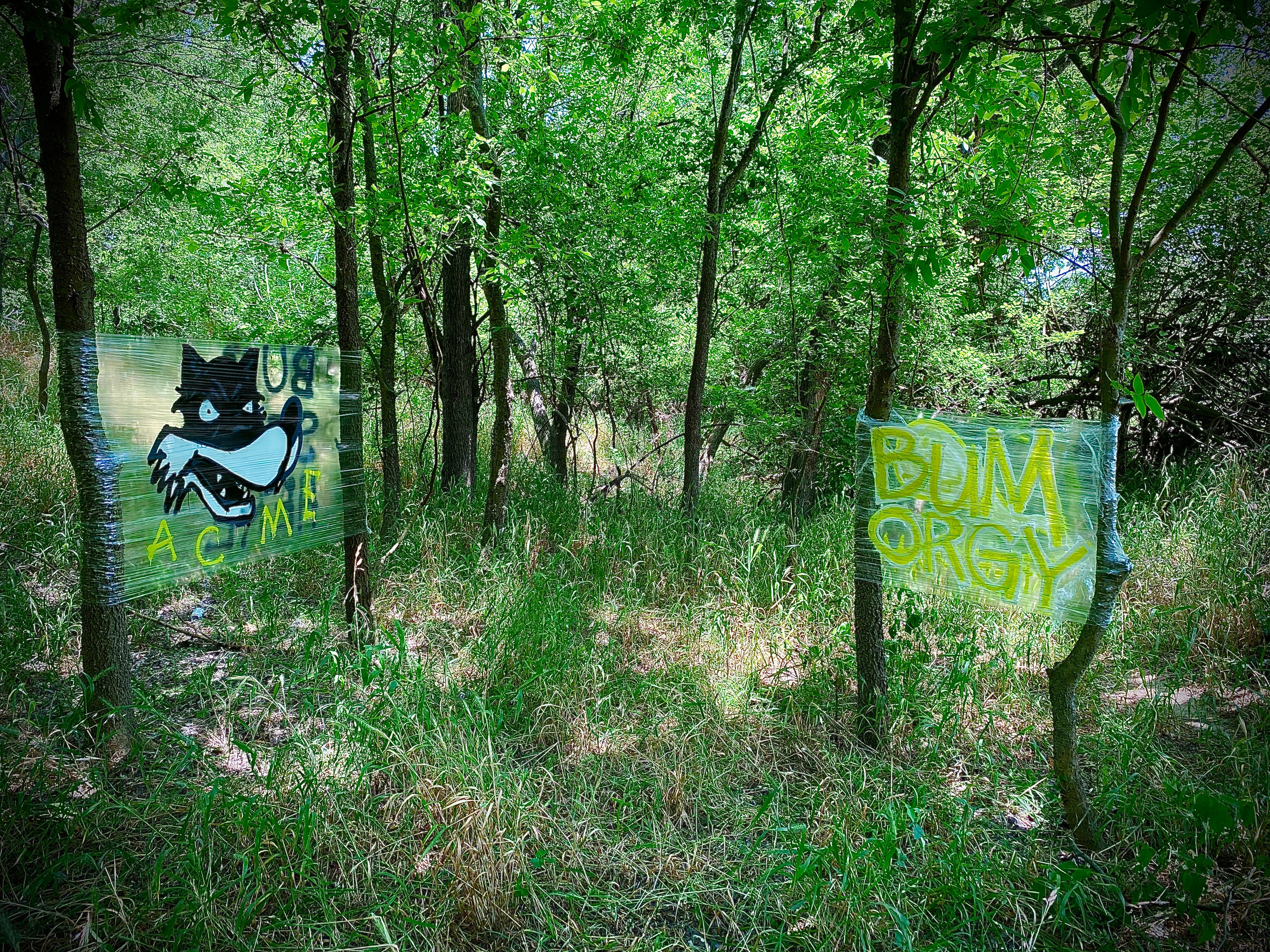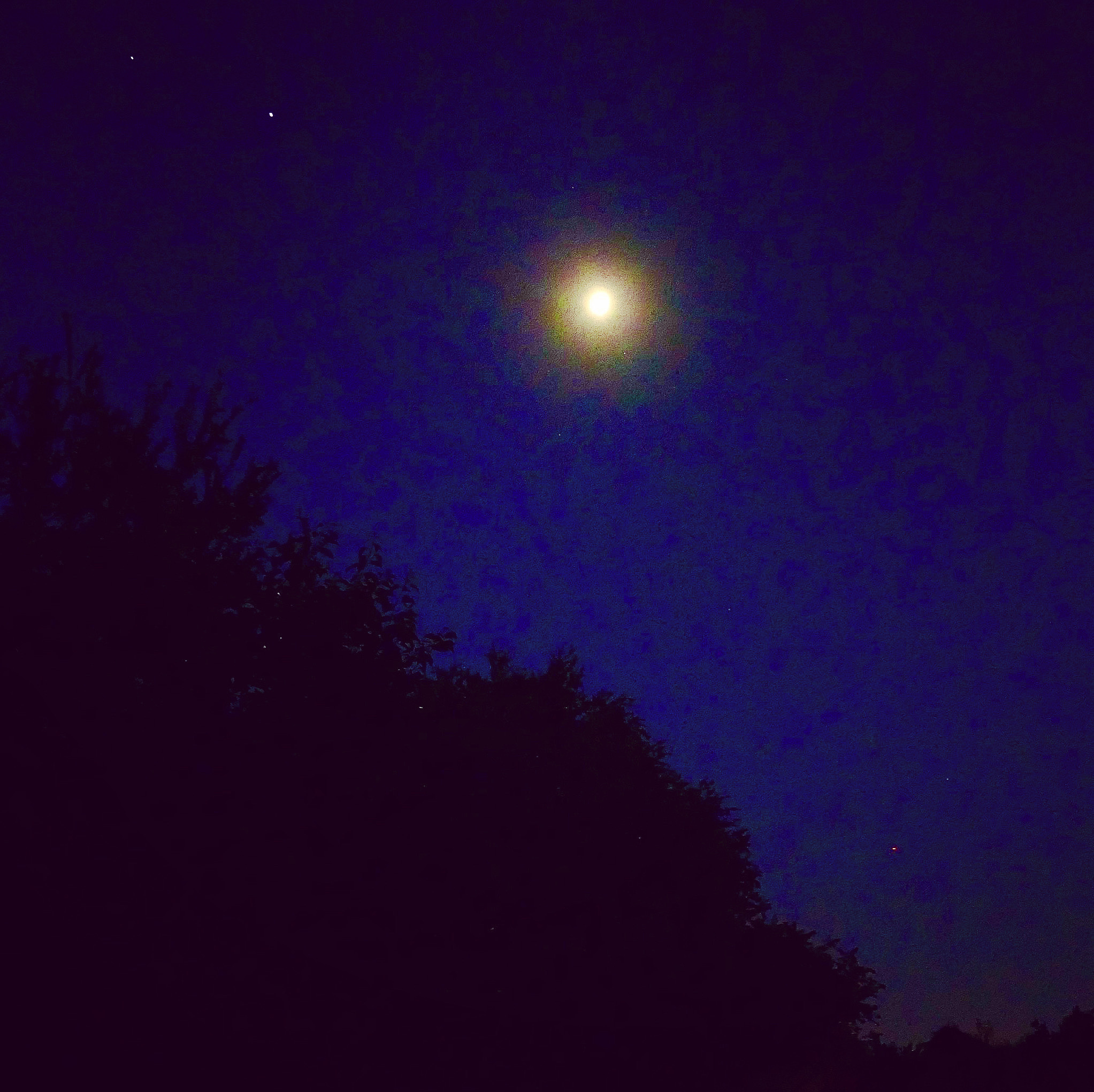 Earlier in the week I went for a run into the woods under the overpass, and came upon an unusual installation of spray paint and cellophane near the river overlook. I’ve seen a lot of weird things down in there over the years, including a gigged stag, the remains of a candlelight chicken sacrifice, a dimensional portal, and several variants of edgeland Gandalf, but this was a new one. Maybe it had something to do with this week’s astrological developments, as the Moon appeared in the early morning sky next to Saturn and Jupiter, with Mars nearby.