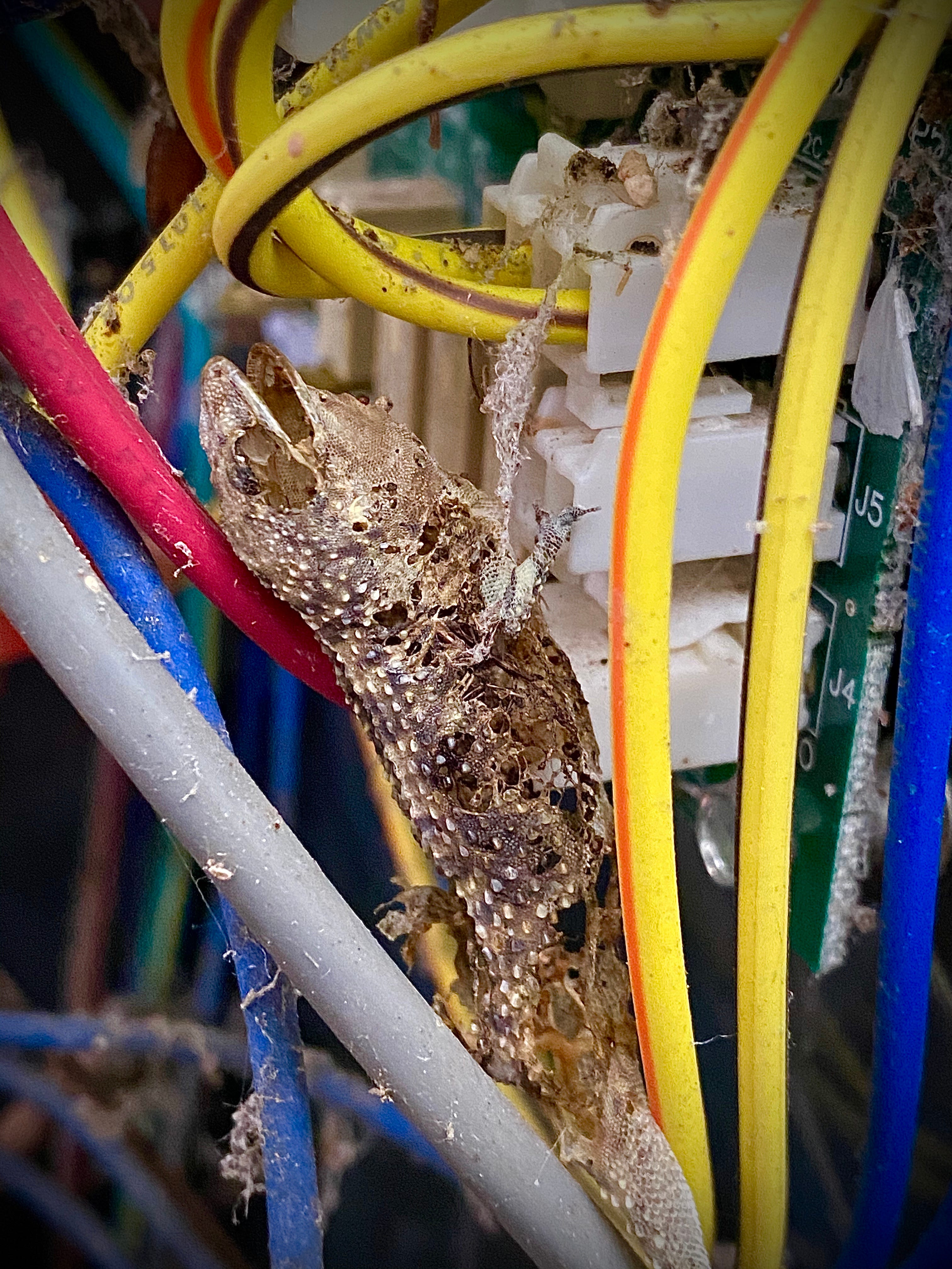 On Wednesday, our air conditioning conked out as the day got up into the low 90s. Texas without air-conditioning is an express ticket to cli-fi dystopia, and when the breaker wouldn’t reset and I went to check the condenser, I investigated further and found ant sign all over the service box. Fire ants love electricity, and they have colonized more than a few lines around here. I was able to get our electrician friend over in the morning, and after a muggy night we opened up the box and found the ants had moved on, and the problem was a short, probably exacerbated by the electrical storm Tuesday night. We also found the desiccated remains of two lizards who had gone for the glow, a gecko and an anole.
