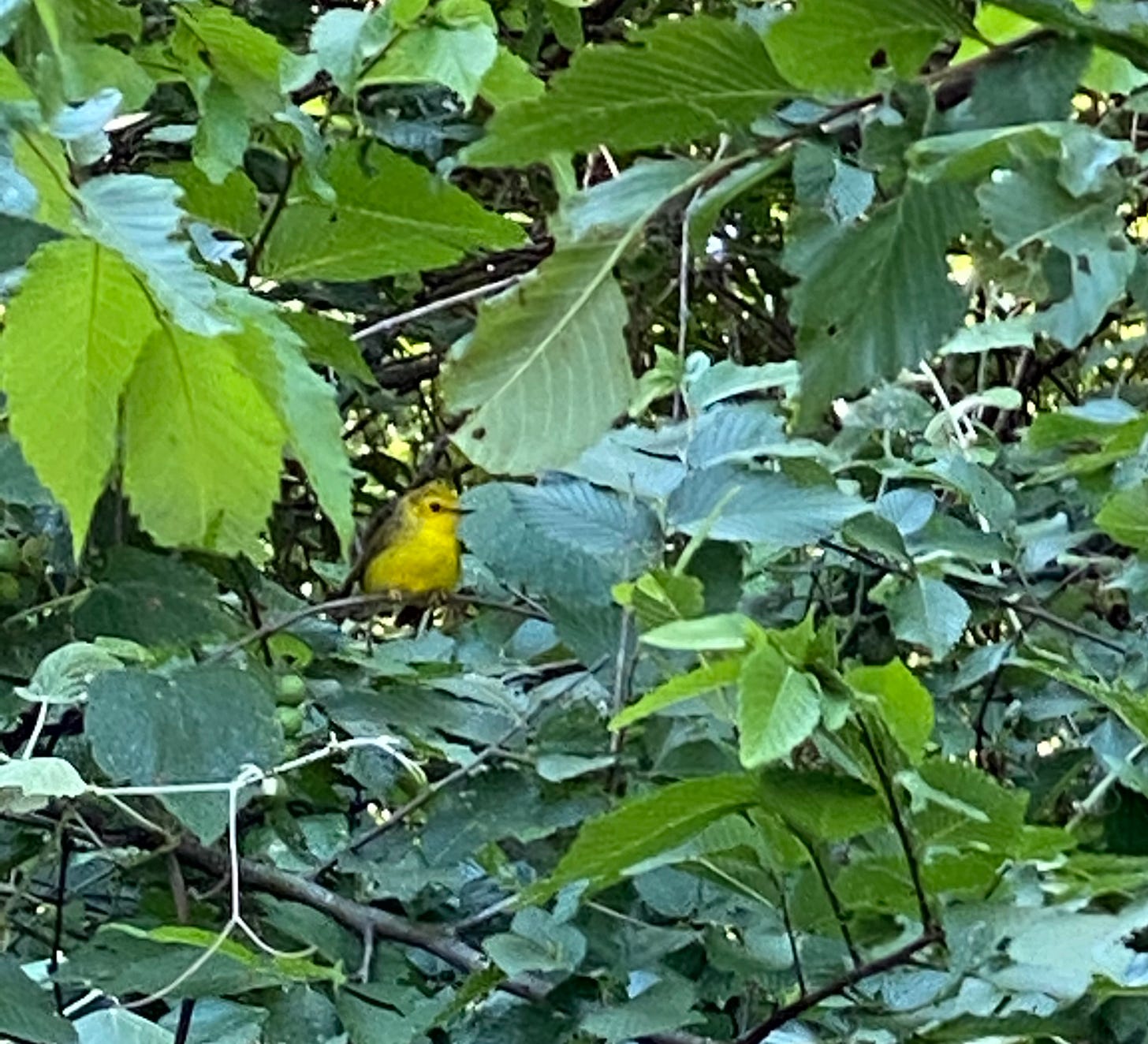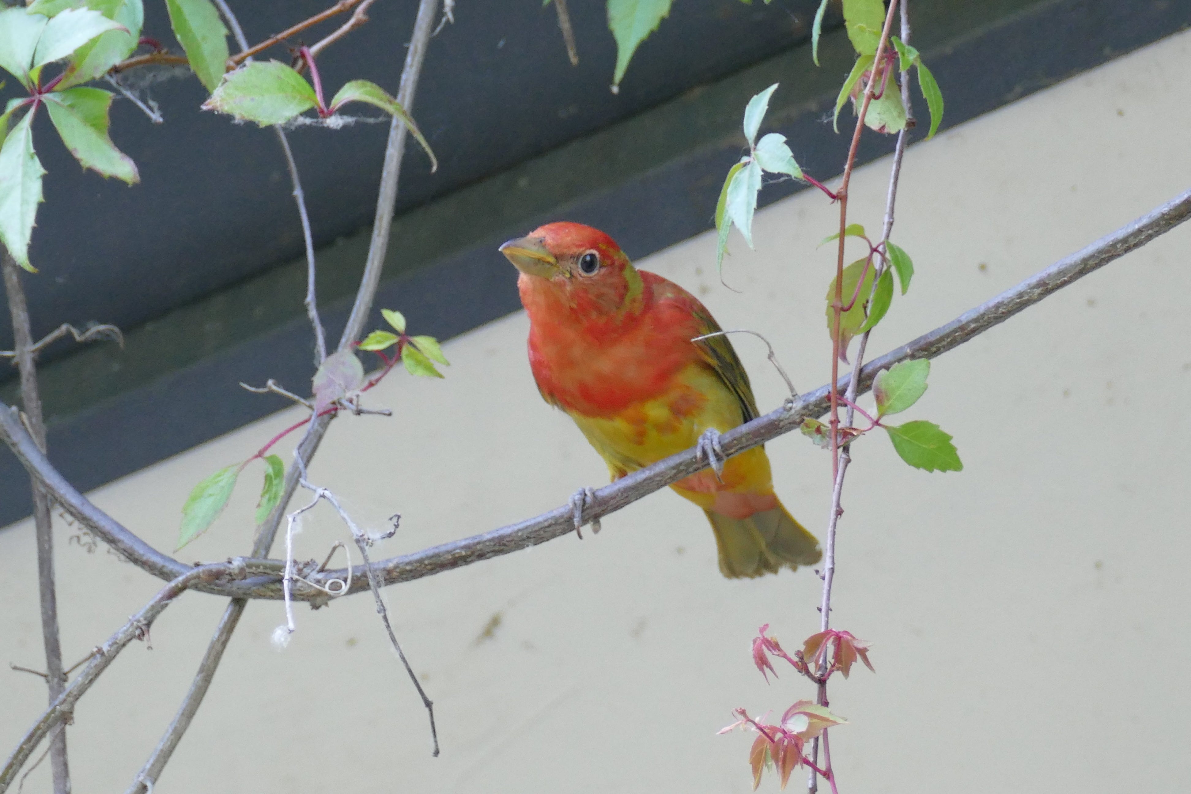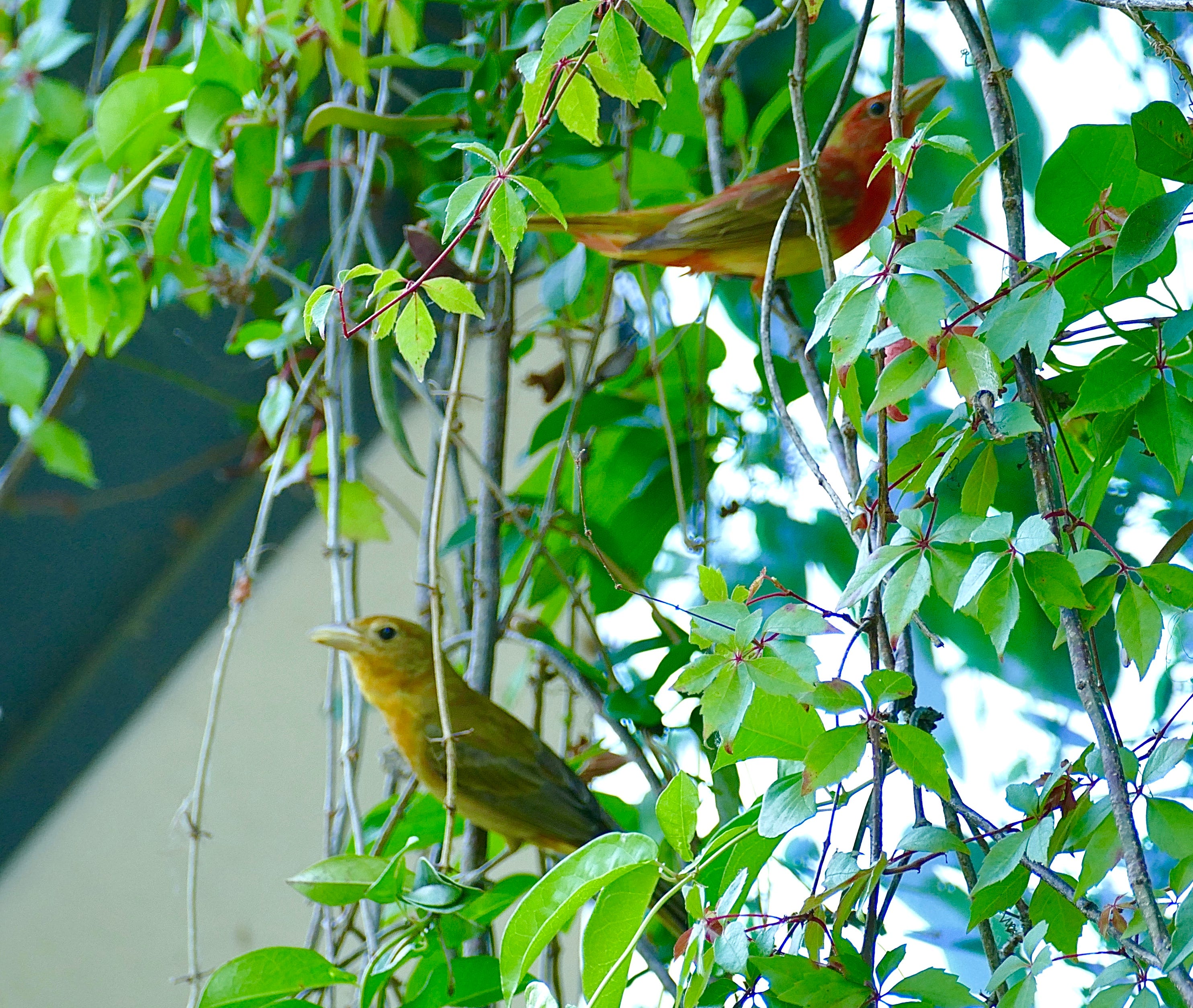 I’d never seen such a bird, and had no idea what I was looking at. I went out for a closer look, and the bird would fly off, then quickly come back. I soon realized it was a pair, with a plainer yellow female. They were chattering at each other nonstop, with a rapid series of sharp chirps. My excitement at these remarkable creatures turned to wariness when I realized they seemed to be messing with the mama cardinal there in the vines, who was guarding her nest. Flame boy in particular was aggressively flying up to the cardinal, perching right by her, as if waiting for her to leave the kids alone for a minute. Our elegant-looking exotic visitors were revealed as teen hoodlums out for a prowl.