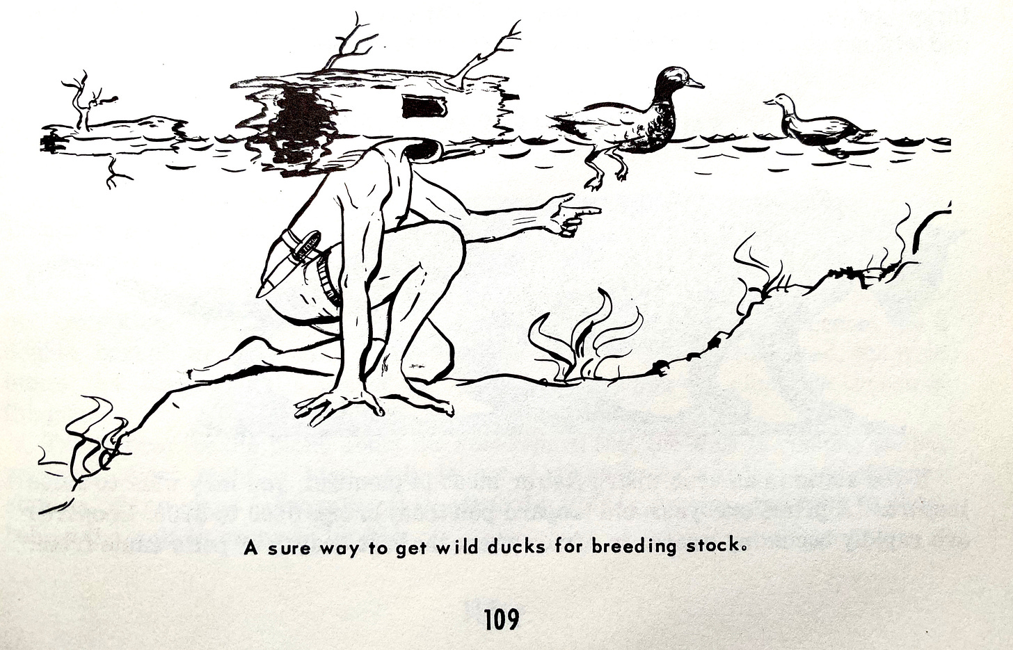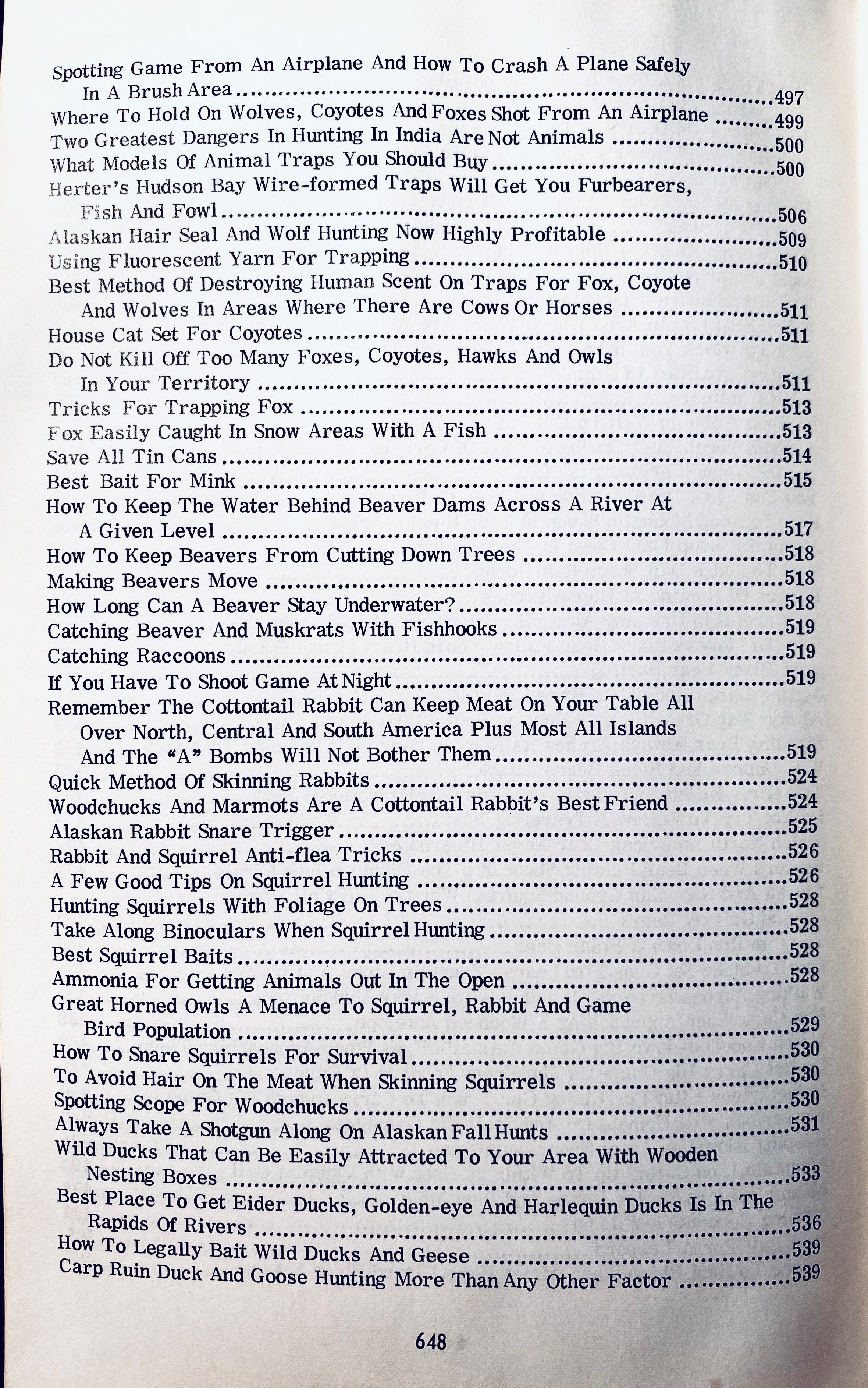 Maybe it was my neighbor’s report that got me to pull this strange volume from my natural history library. It’s probably been fifteen years since my NYC archivist friends gave me this book, something they found in the used bookstore near their weekend place upstate, which they handily bookmarked in a dozen spots with entries they knew I would especially appreciate. HOW TO GET OUT OF THE RAT RACE AND LIVE ON $10 A MONTH by George Leonard Herter an Berthe E. Herter is a self-sufficiency guide, as the title suggests, part of a rich and peculiarly American genre. But it’s more than that, crammed with every idea the authors could come up with, delivered free of any coherent editorial organization, many of the ideas surely fictions that would be more likely to injure hunter than prey if attempted in real life.