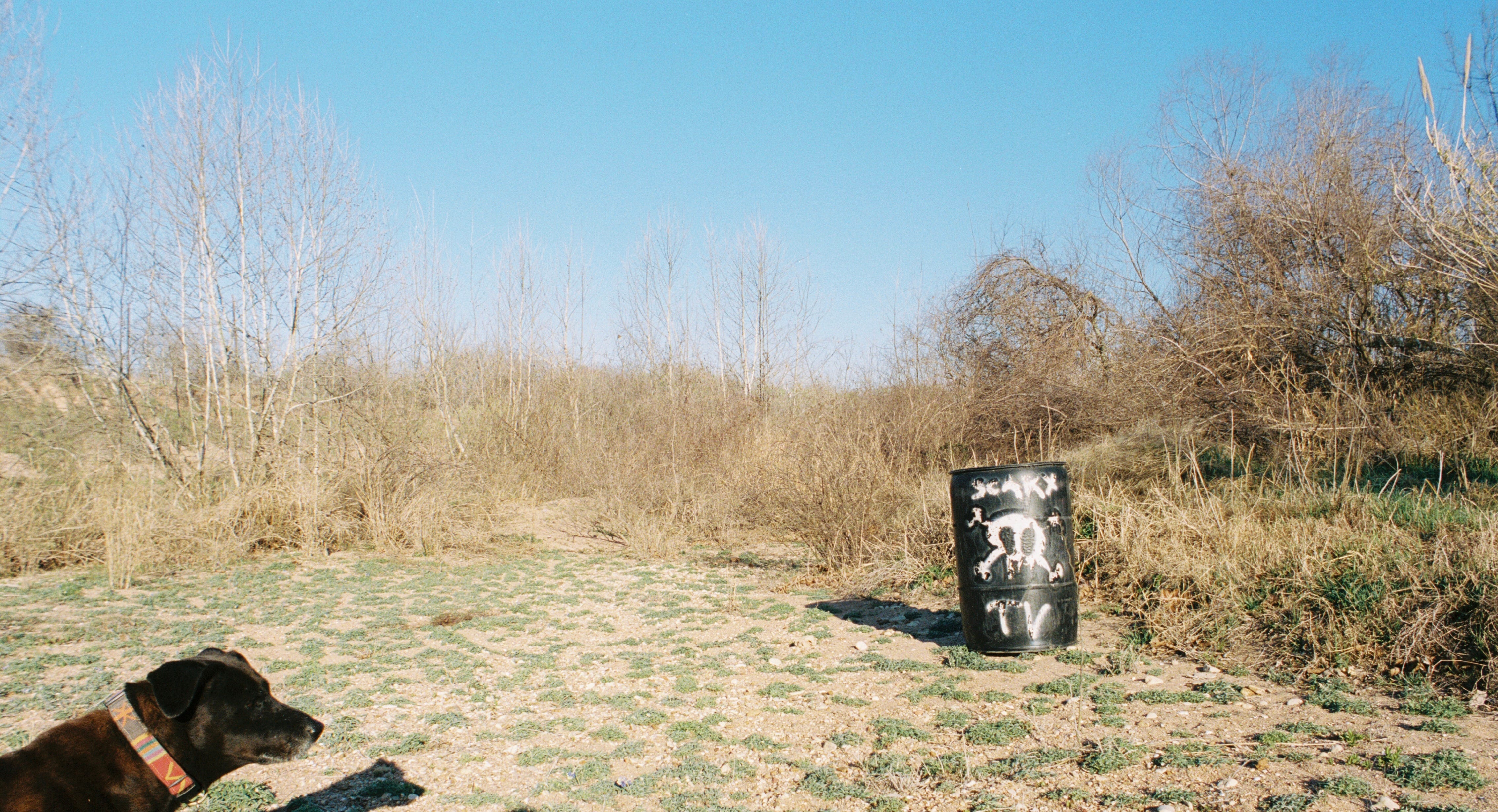 We managed to commune with the owl for 10 minutes, walking off without causing it to fly off, and then worked our way back along the river’s edge. The bluebonnets are starting to bloom in earnest, prettying up one of my favorite edgeland landmarks: the old plastic barrel tagged with the skull and crossbones of ScaryTV. I’ve seen those tags around over the past few years, and always dug its cathode ray charisma. But its authorship was always unknown.