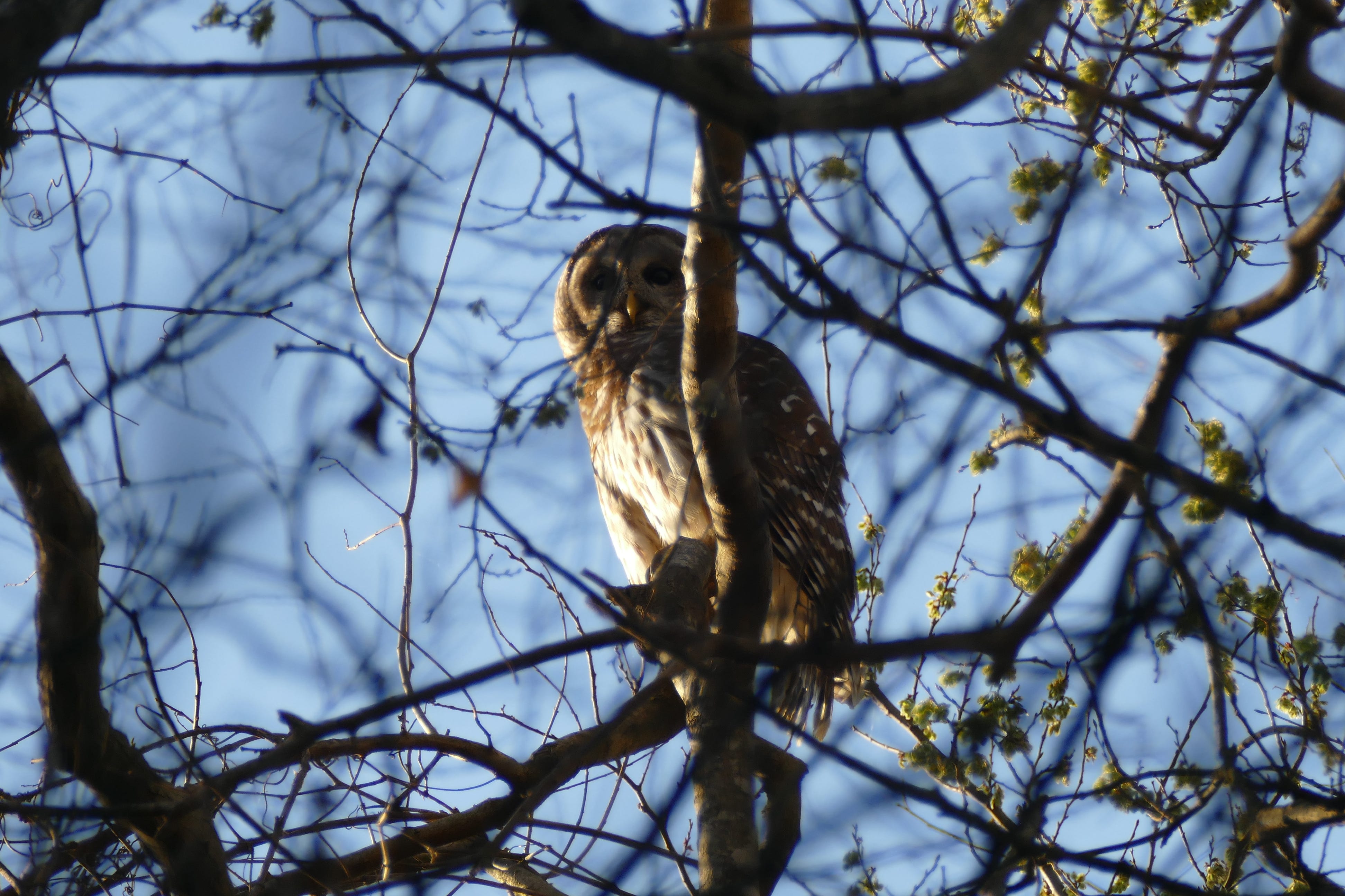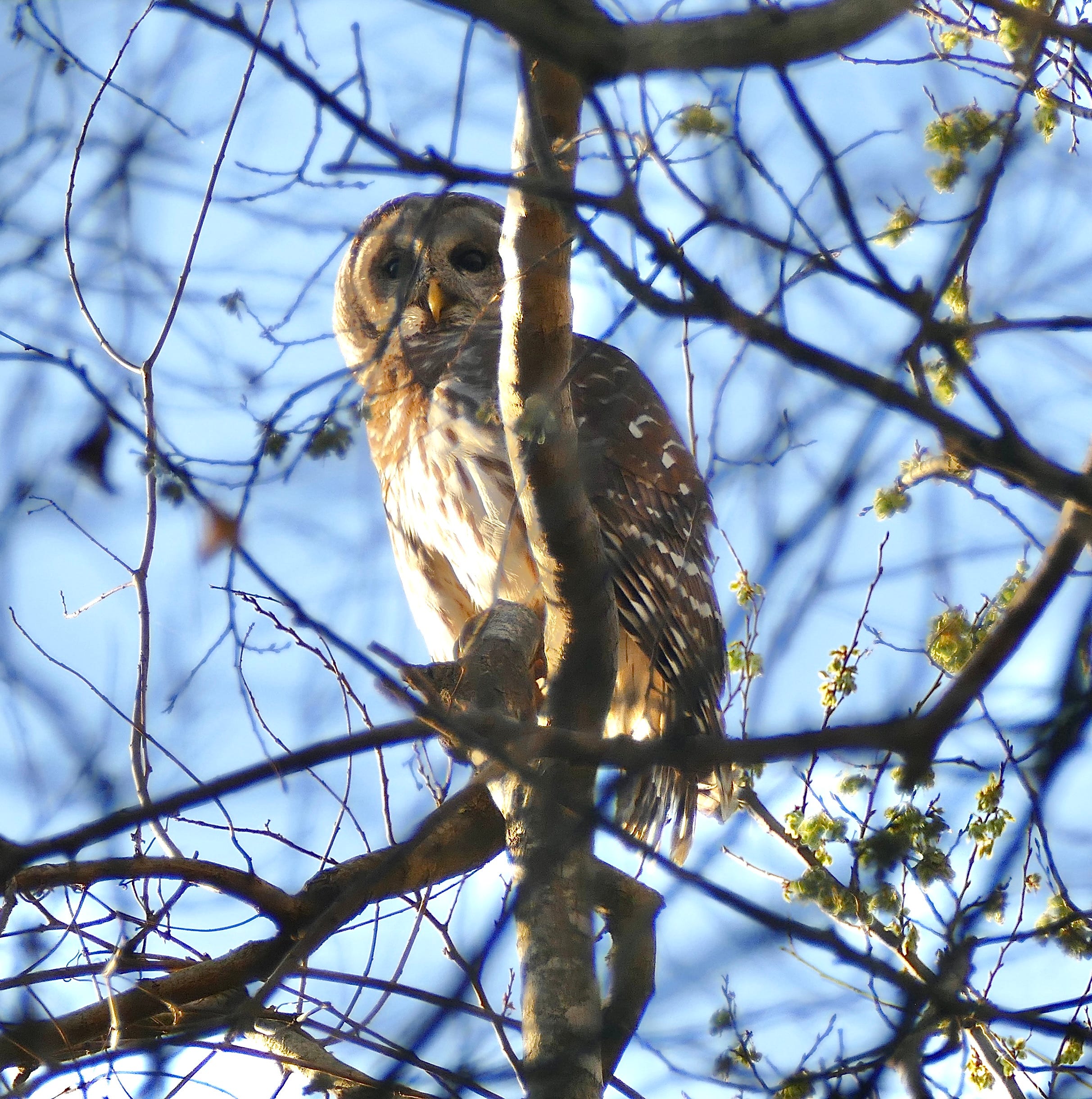 As we walked, a big dark shadow flew right over our heads. Not actually a shadow, but a raptor, thicker than a hawk and faster than a vulture. We watched it alight on the branch of one of the trees along the path. A barred owl, one of the ones whose eerie calls across the woods I have been hearing in the mornings and evenings since winter began to finally wind down. I have seen many of those owls in these woods over the years, but they usually take off at the first sign of human eyes. This one didn’t mind us, at least once we paused and it could tell we were going to give it its space.