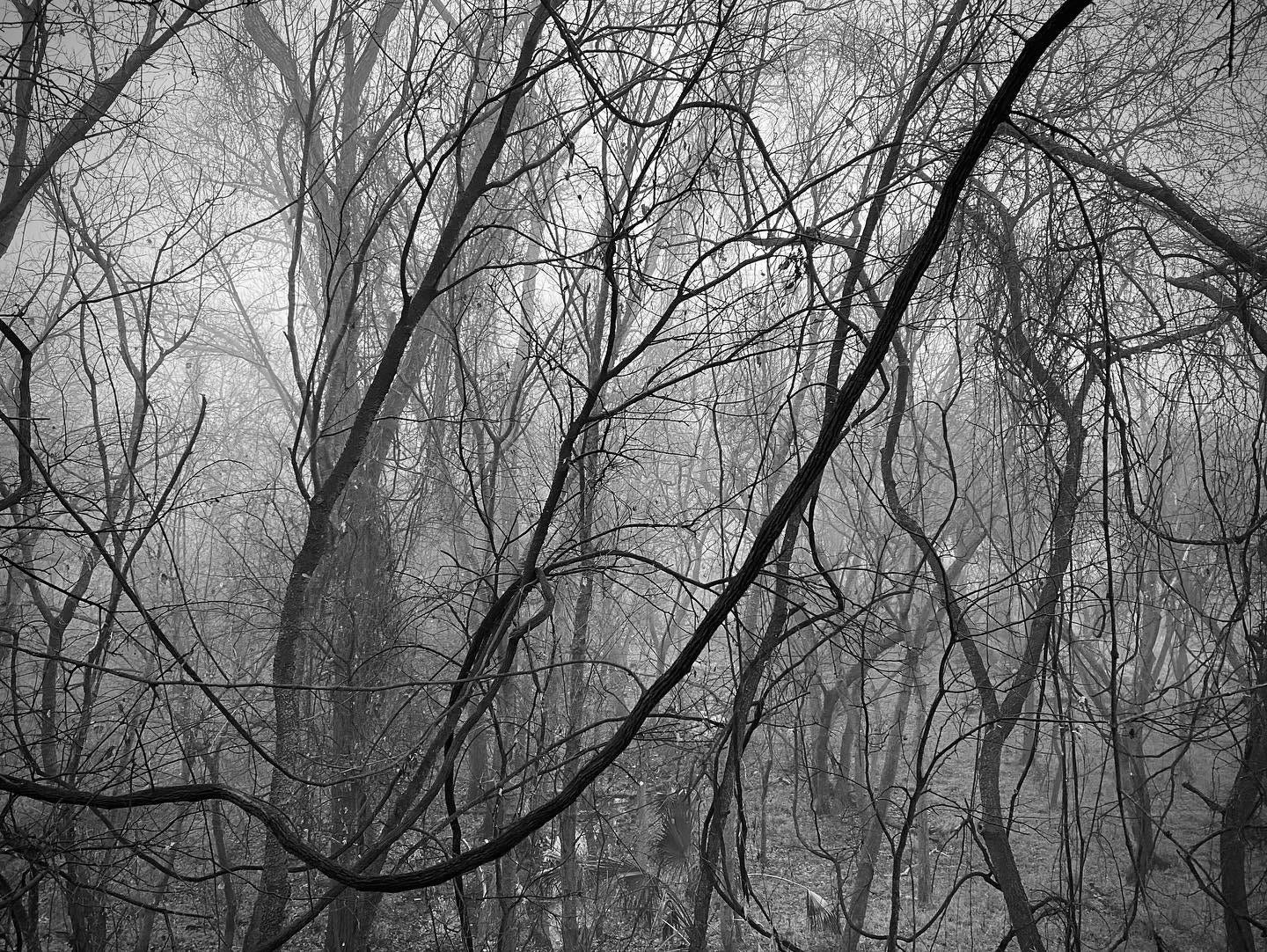 Lupe is in her silver years now, and less inclined to chase after the big groups of deer we see moving through the woods. We tracked one septet down along the lost path of the old ferry road, then diverged where that road dissolves into a wetland where the road used to cross the river. We walked into the labyrinth of hackberrys that grow up out of the decades of dumped concrete, in the heart of the parcel that once was a gravel mine but now is a preserve, the kind of “park” in an industrial part of town where the municipal authorities don’t really do anything to manage it, and you get to see how nature can quickly establish its own fresh ferality in one of those pockets of urban negative space where it is left alone to do its own thing.