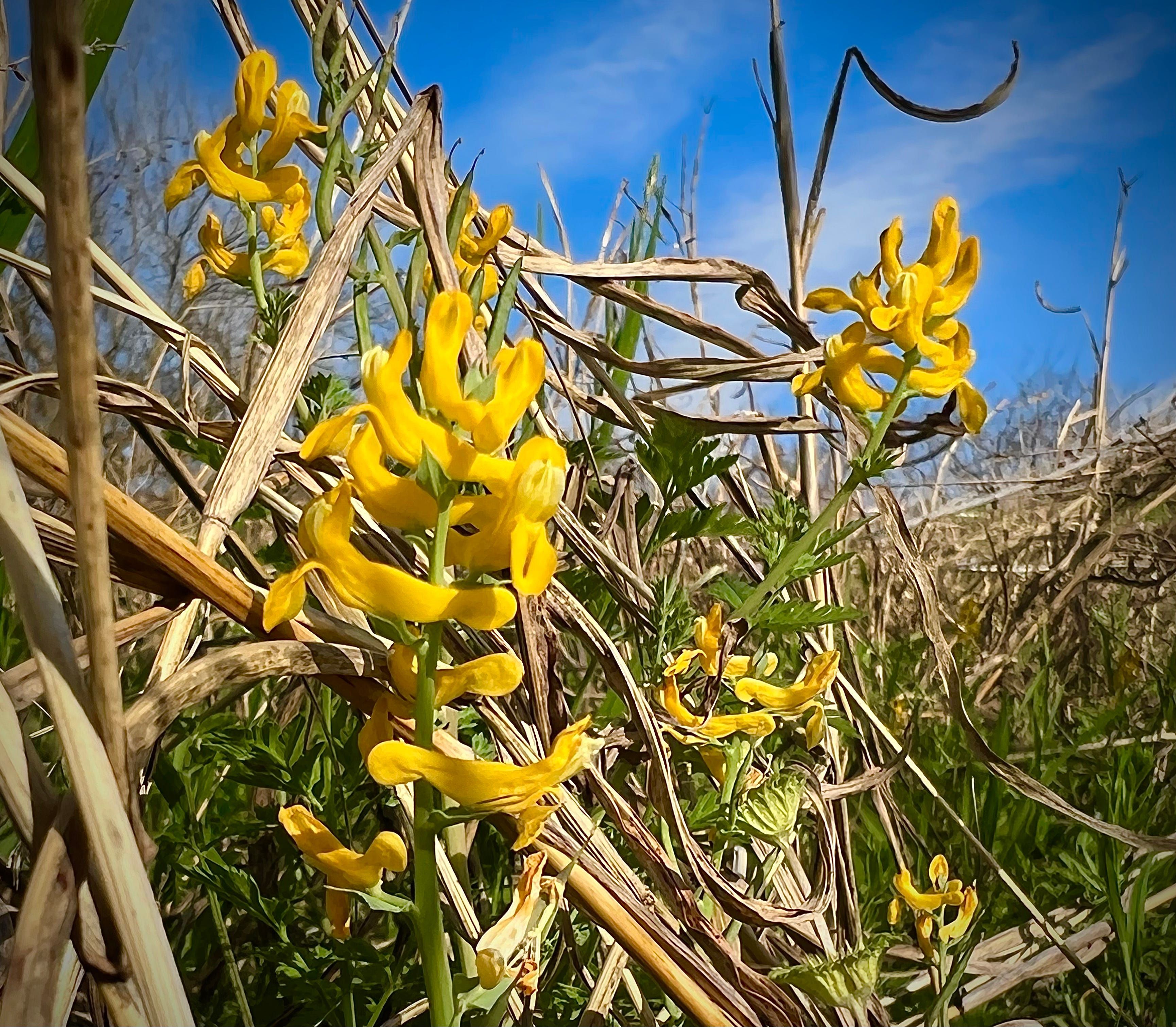 All through the woods behind the factories, the inland sea oats are coming in green, at least in the patches where the plants have established enough to keep the invasive brome out. Little clumps of thick dark blades arising from the leaf litter, crowned by the taller, browner growth of the year before. The sea oats don’t mind the shade, and it’s interesting to sea how well that species of native grass thrives by virtue of that adaptation, while the areas where we have cleared the trees get quickly overtaken by invasives adapted to sunnier and warmer climes. There’s still a good bit of brome grass down in the woods, too, but in better balance. In the moment between winter and spring, the mix of grasses gives the forest a bright green shag carpet across its floor, underneath the more austere timbers of tall bare trees and the lattice of thick woody vines that hang from them. The contrast is stark, especially in a season like this when the wildflowers are a few weeks behind schedule.
