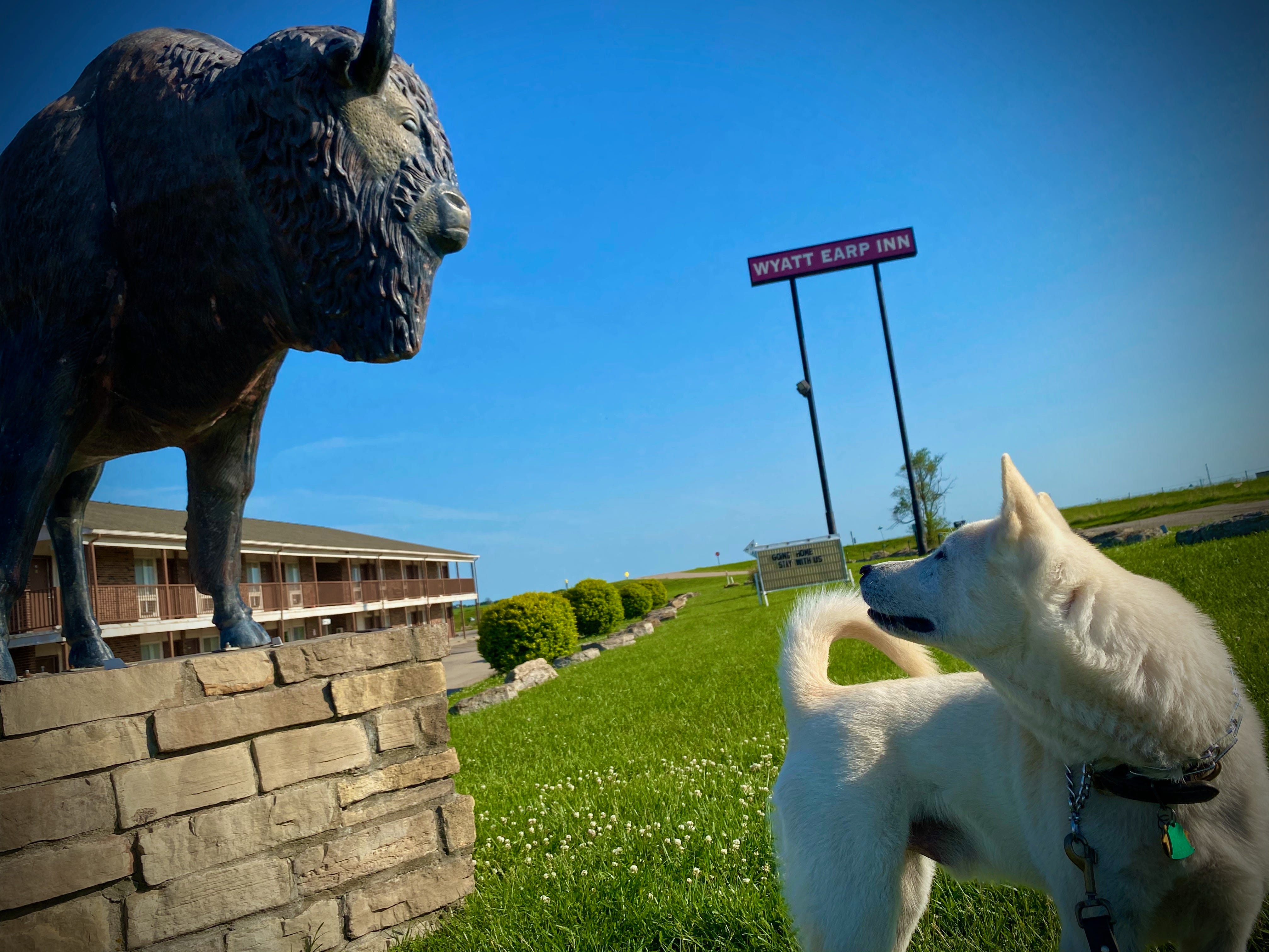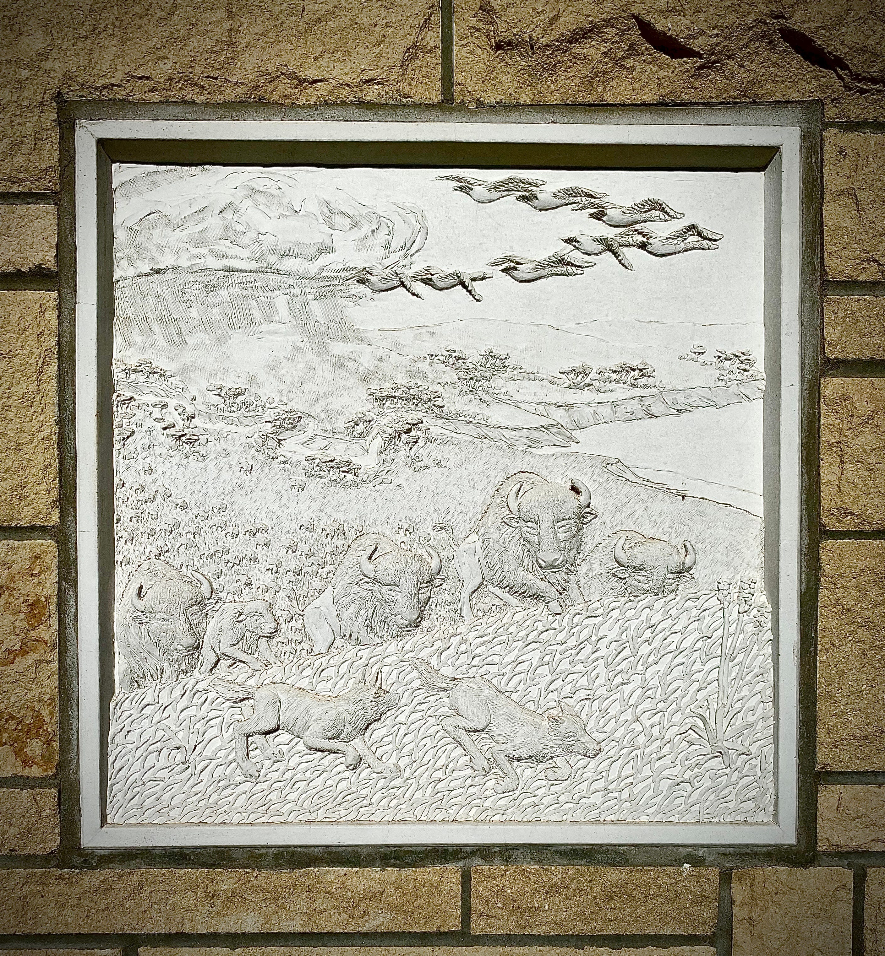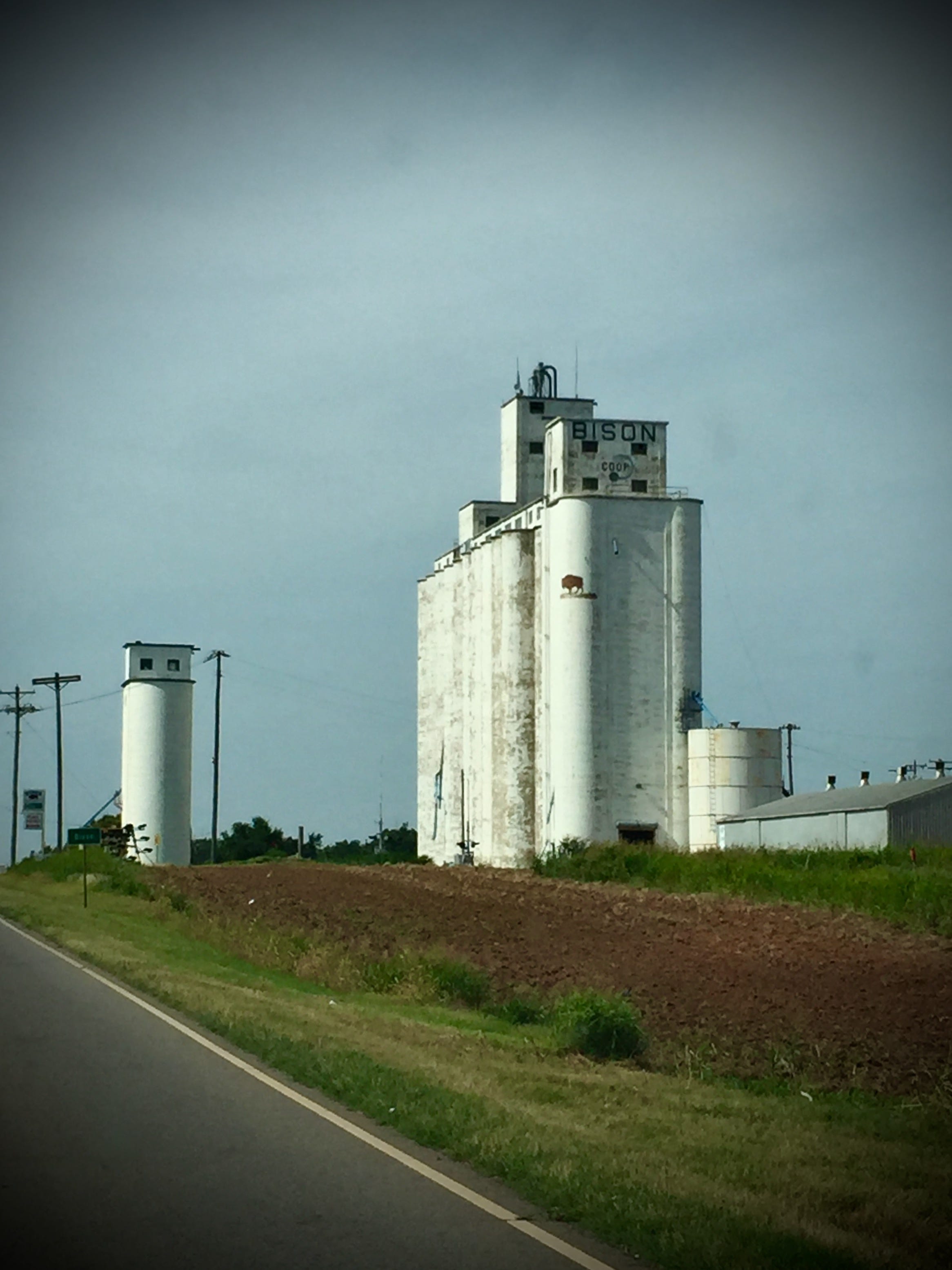 The first service area on the Kansas Turnpike as you roll into the Wichita Vortex from the south is the one where they give out the free maps that tell you all the places you can visit. I have a hat I bought in the gift shop there a few years ago, a green ball cap embroidered with a picture of a buffalo and the name of the state. The buffalo images are everywhere when you cross the Great Plains, as mascots on the sides of municipal water towers and totems outside the run-down motels, but you never see any real ones.