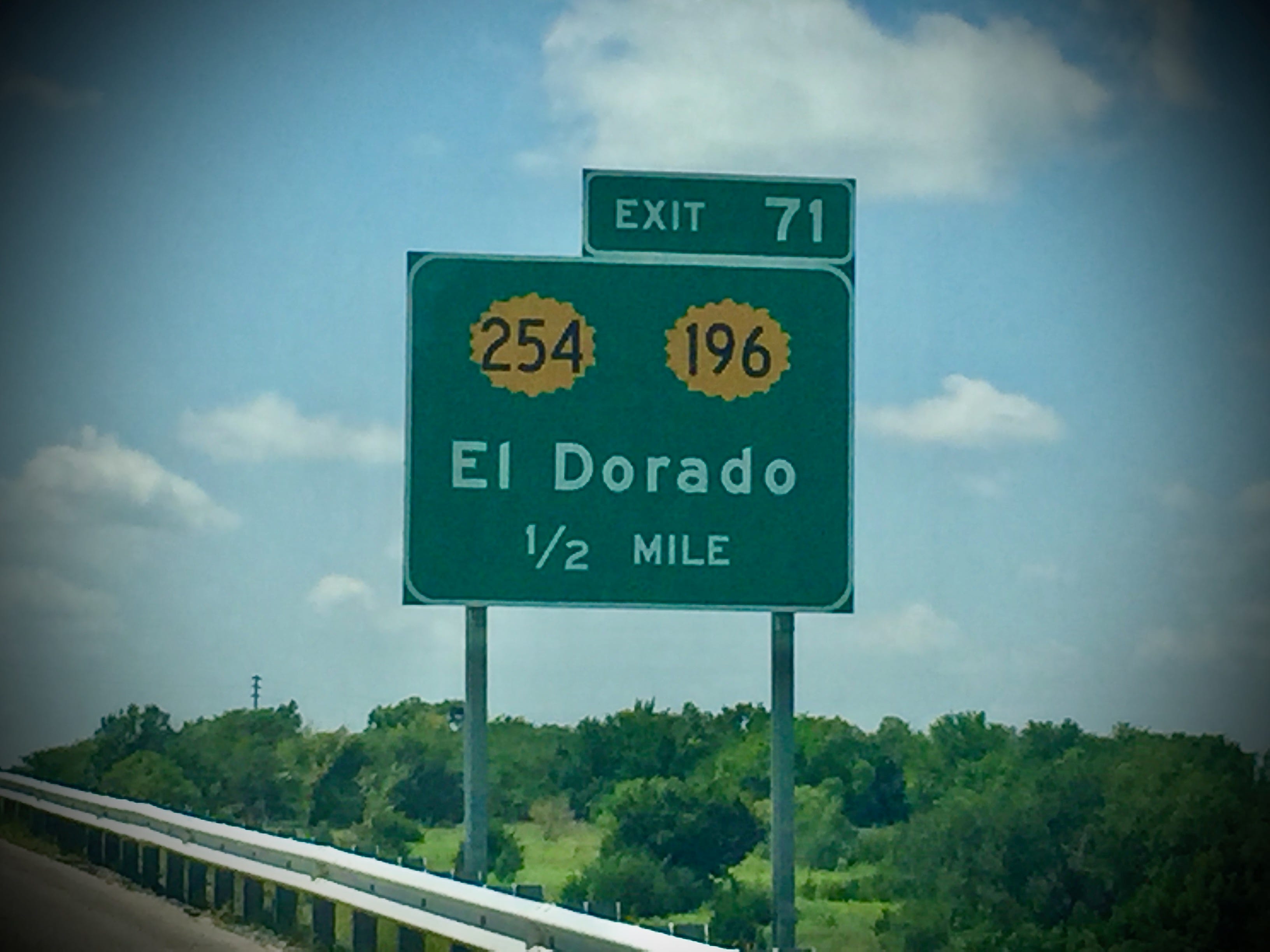 I have driven past those signs for El Dorado dozens of times over the past two decades. It’s the hometown of my friend and fellow Austin fabulist Brad Denton, a town of flareoffs and drowned forest. On the way back yesterday I learned Coronado actually came through here on these same routes, in 1541, looking for lost cities of gold.