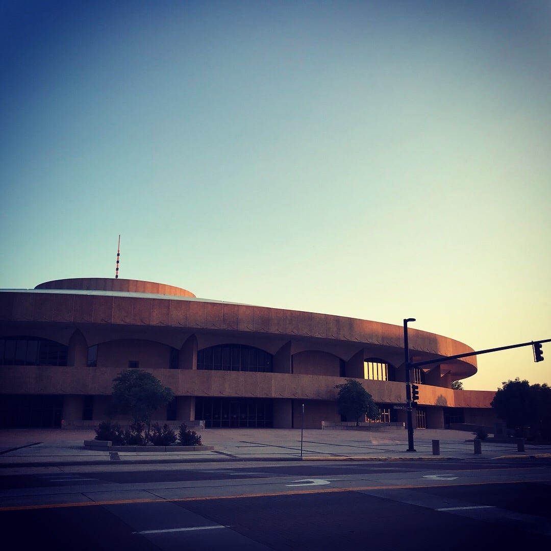 Like the land around it, downtown Wichita is a weirdly atemporal place. Very few of the buildings appear to have been constructed after 1979, and something about the climate makes them all look new. The Arkansas River cuts through the middle of town, with a utopian little greenbelt, bringing waters flowing down out of the eastern side of the Rockies then in slow meanders across the plains. It’s a river I saw once closer to its source, stopping for lunch in a Colorado hippie town that seemed to be from a song John Denver would have written if he were cooler. But the light is different in Wichita, the way it’s different in Marfa, the kind of light that alters reality just enough.