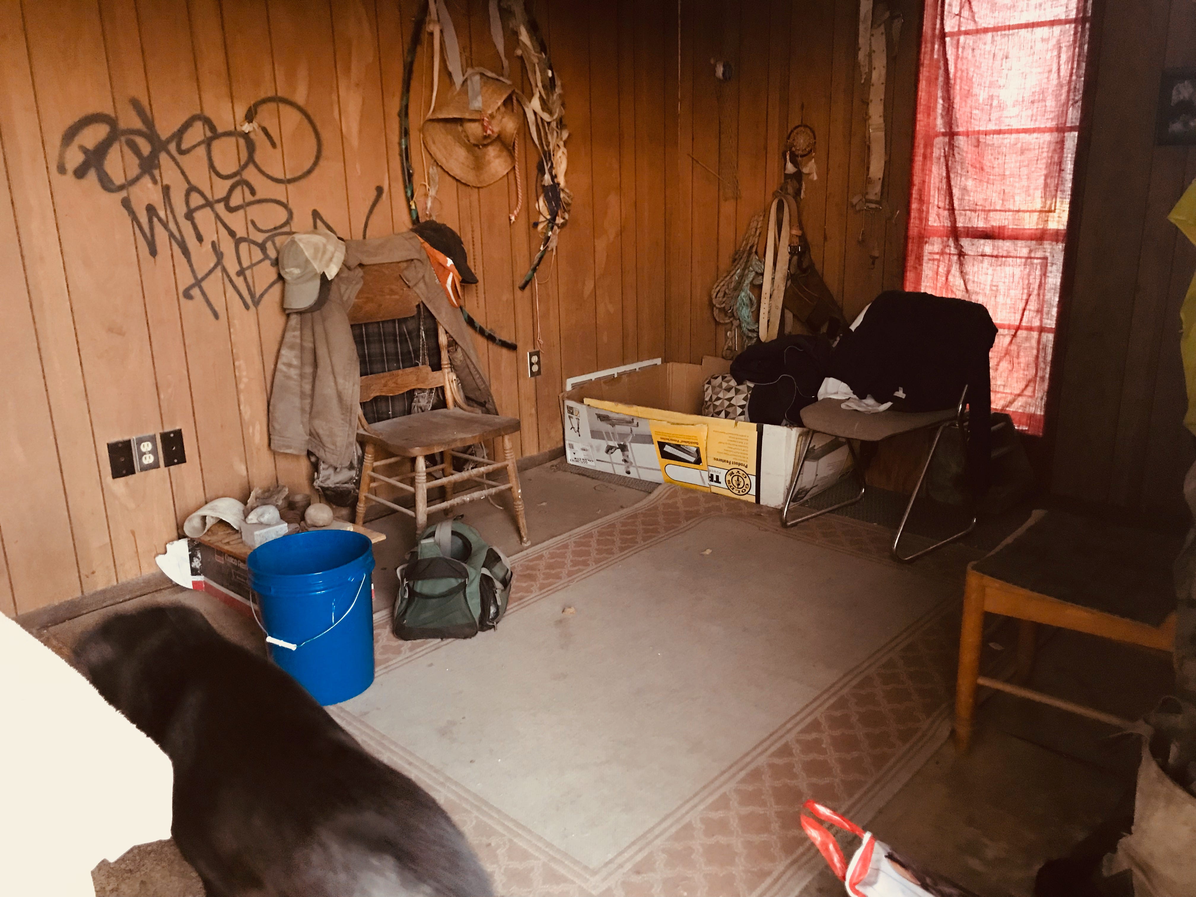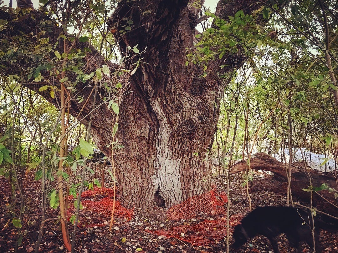 Phil told me he found the place where he stays a decade ago, after he walked back from Missouri. It’s an abandoned building near a highway, a structure that appears to have once been a single-family home and more recently served as the office of an industrial minerals operation. You can see it from the road, but you wouldn’t even know there’s a building there, because it’s completely covered in mustang vine and other wild vegetation, under the canopy of one of the oldest and thickest oak trees in the county, which has somehow survived as the pavement gets closer and closer.