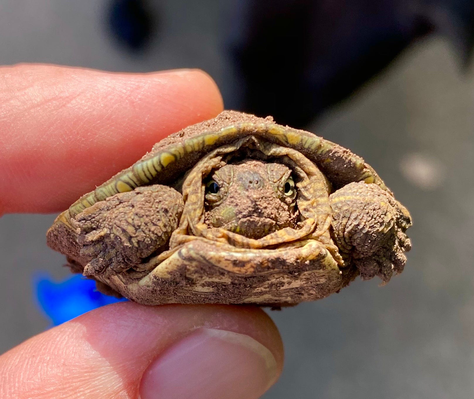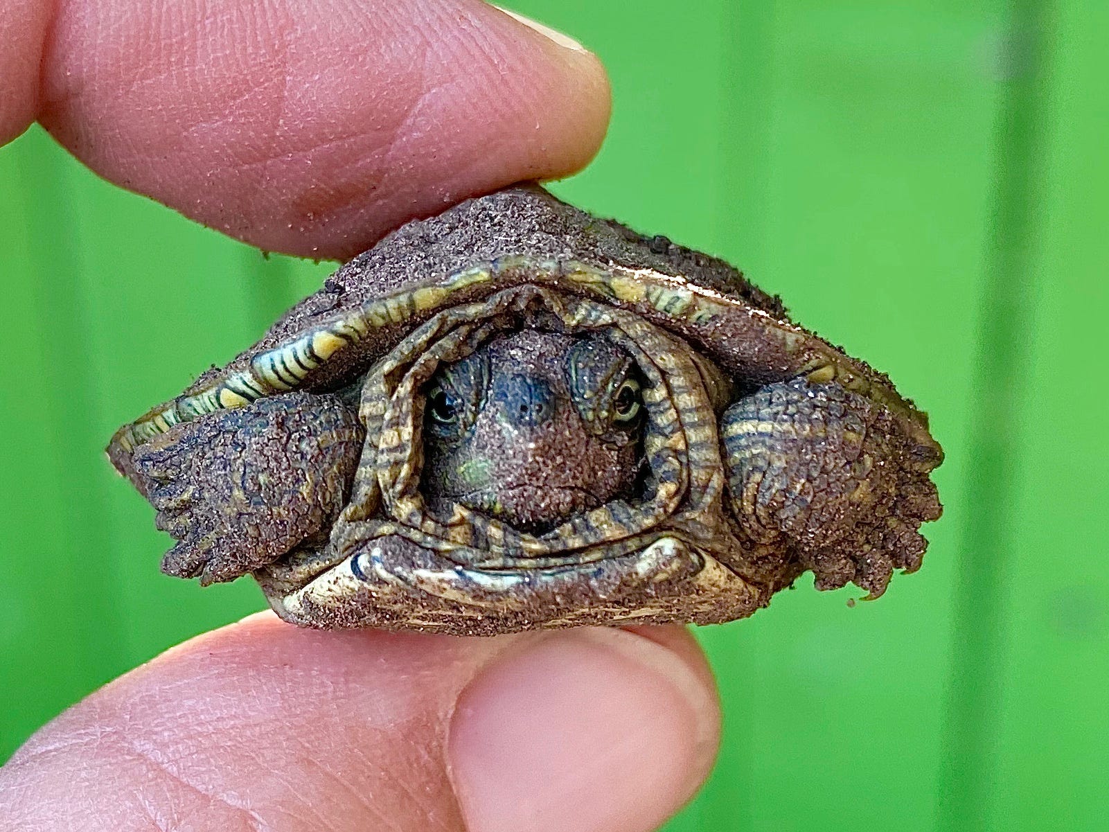 I say it’s a snapping turtle, but that’s a guess from the structure of the face and shell, and looking at those stripes in the photo I wonder if I have it wrong. Corrections welcome, whether in the comments or by reply email.