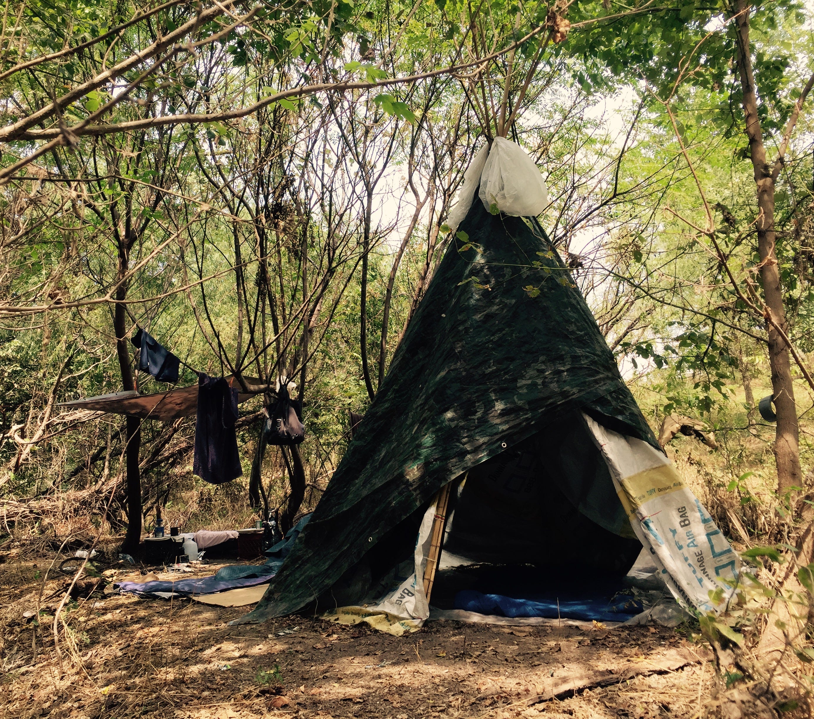 Last year I volunteered for the local homeless count, figuring I already knew where many of the camps are. I was assigned to a quadrant across the river. We met up in the grocery store parking lot at 3 a.m. with our flashlights and clipboards, and spent about six hours at our task. We found people sleeping outside just about wherever we went, starting with the people sleeping in the cars in the parking lot, and ending with camps at remote side trails deep in the riverfront parklands that I often explore. Under the bridges that cross the creeks behind Riverside and Pleasant Valley, we found entire shanty towns, and collected the story of every one of them who was willing to share. The last camp we found was the biggest, like a huge village in the woods between a library and a major road. It had been recently cleared out, probably to make room for the redevelopment project under construction there now, but still full of the things people couldn’t carry with them..