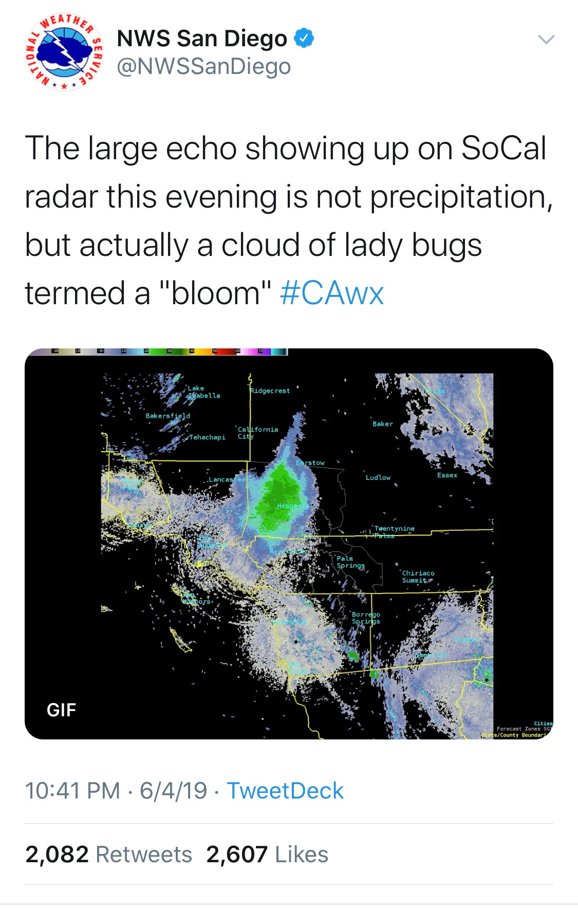 Biological emergences so massive they show up on the weather radar are always awesome, and it’s reassuring to know there are species that can still flourish in the urbanized environment enough to express like that. I have seen Biblical swarms of tarantulas in West Texas, so many on the roads that you can’t avoid running them over, but at least they can’t fly. Lady bugs can: