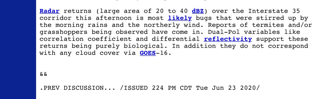 Thunderstorms blew in on Monday night, bringing us much-needed rain. When the storms began to clear Tuesday, strange clouds of a different sort started to appear on the weather radar, over the Interstate 35 corridor. The Austin/San Antonio office of the National Weather Service began to collect eyewitness reports of what appeared to be termites or grasshoppers. My friend Rob shared this Fortean outtake from the NWS page on his feed: