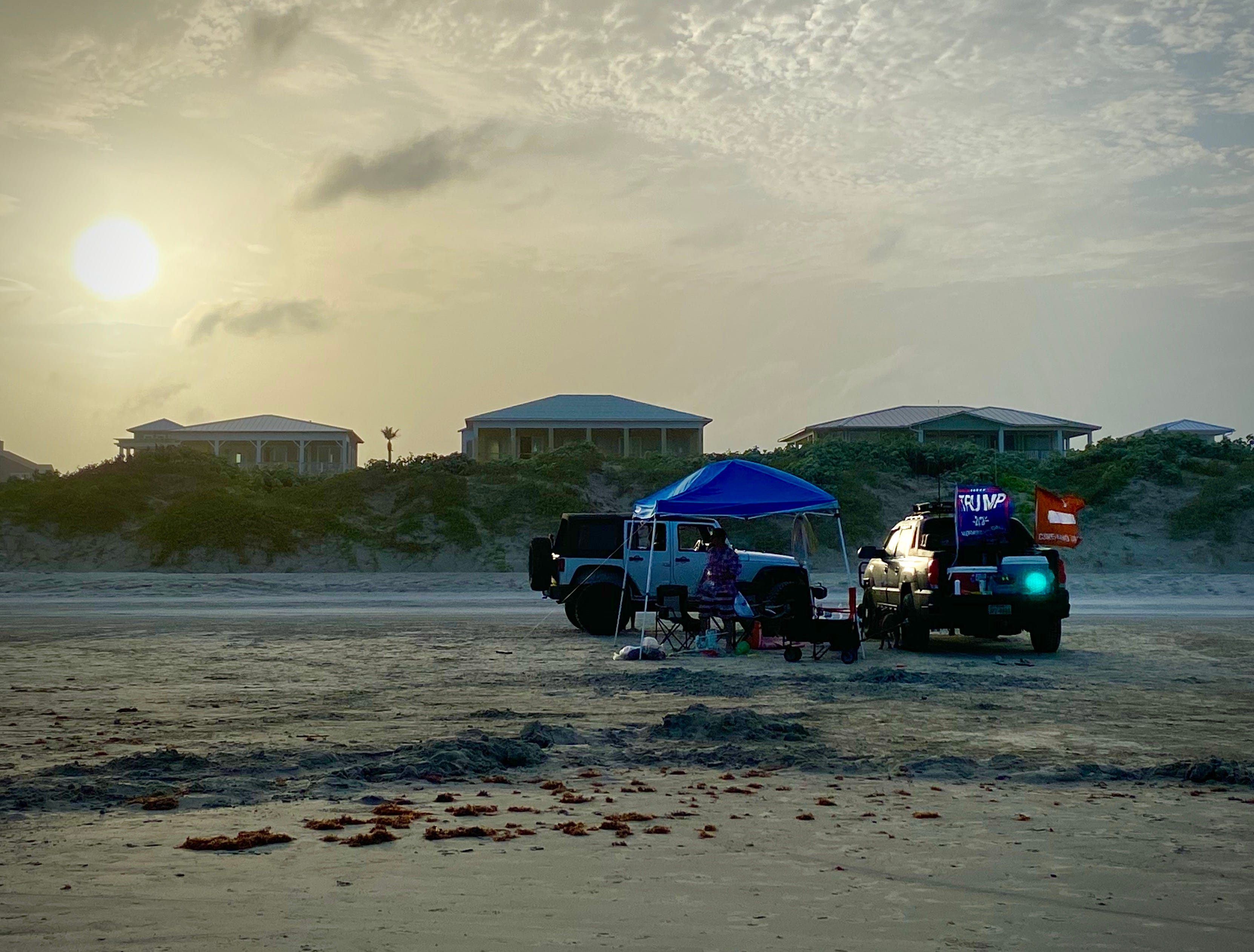 Yesterday evening, not long after we found a massive concentration of grackle nests in a patch of mesquite trees behind a truck stop, right next to a South Texas Tesla charging station, baby and I walked down to the beach. The Saharan dust cloud was evident all the way from Austin, and as the sun went down over the barrier island, above the Texas beach where you can drive your vehicle right up to the waterline, it looked like the matte-painted sky from some 70s sci-fi movie about the ozone future we now live in. But the breeze was up off the Gulf, and the pelicans looked pretty content as they drifted the afternoon thermals. As we walked back, we saw some gulls fighting over a piece of food trash behind a condo.