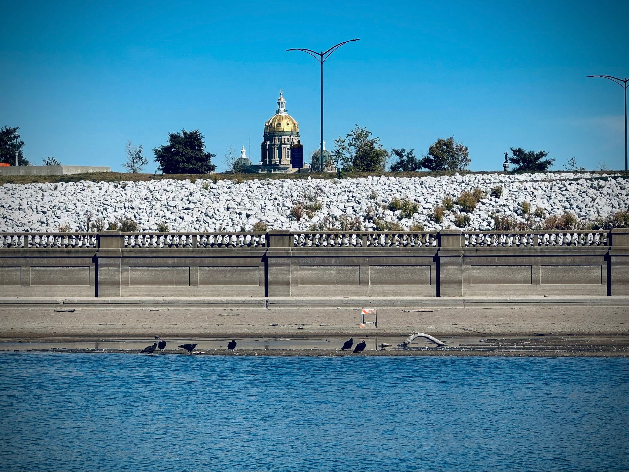 The Des Moines River, a major tributary of the Mississippi, is heavily engineered, the wide stretch that flows through downtown tamed with concrete banks. There’s a paved trail along both sides, elaborately navigating around the massive floodgates. There’s also a lower, older trail, right at the water, narrow and with no railing, perhaps intended mainly for workers tending to the infrastructure of riparian control. When I saw the stairs down to that, I took them.